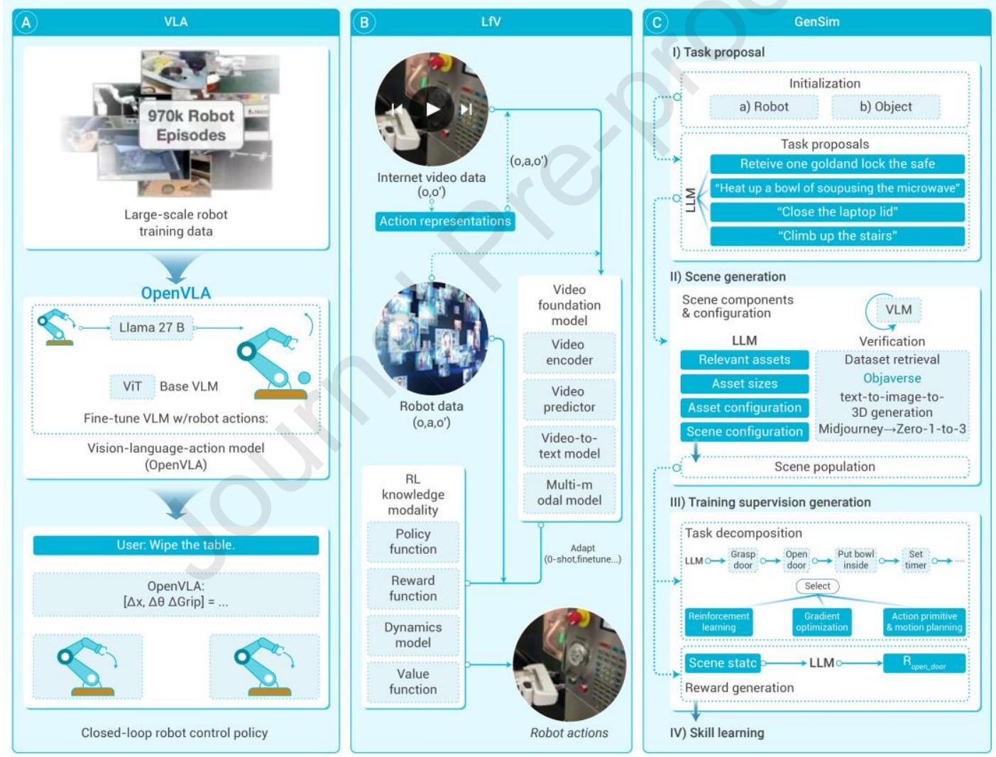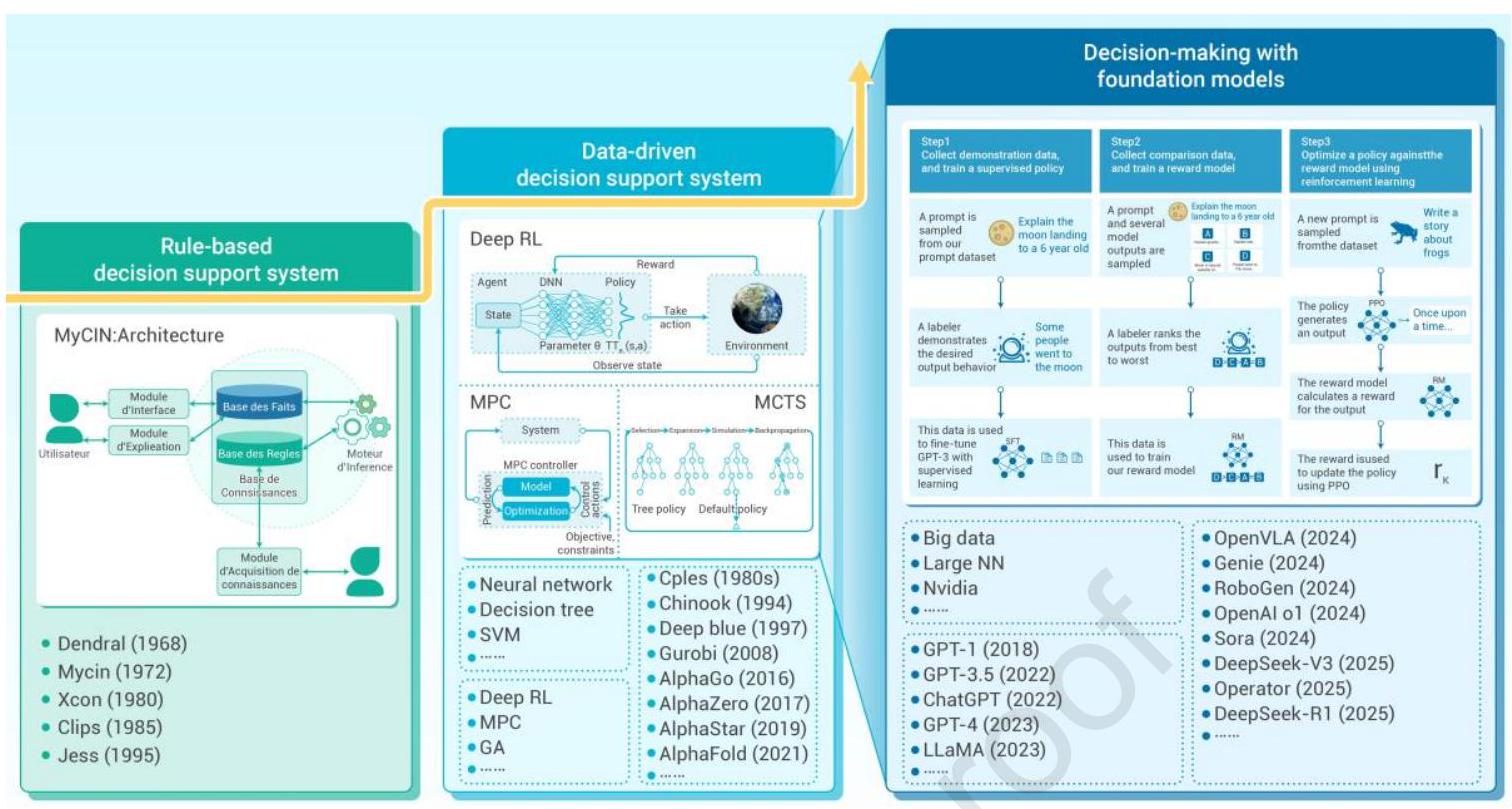 图1:智能决策的发展历史。基于规则的决策支持系统通过规则库和事实库实现决策支持,适用于规则明确驱动的场景。数据驱动的决策支持系统结合神经网络、决策树等技术,应用于深蓝和AlphaGo等项目,并在多个领域超越人类。基于基础模型的决策作为数据驱动决策的新兴技术,通过演示数据收集、数据标注和奖励模型训练等步骤,利用大型模型(如GPT系列和LLaMA)实现决策优化,典型应用案例包括OpenVLA、RoboGen等。