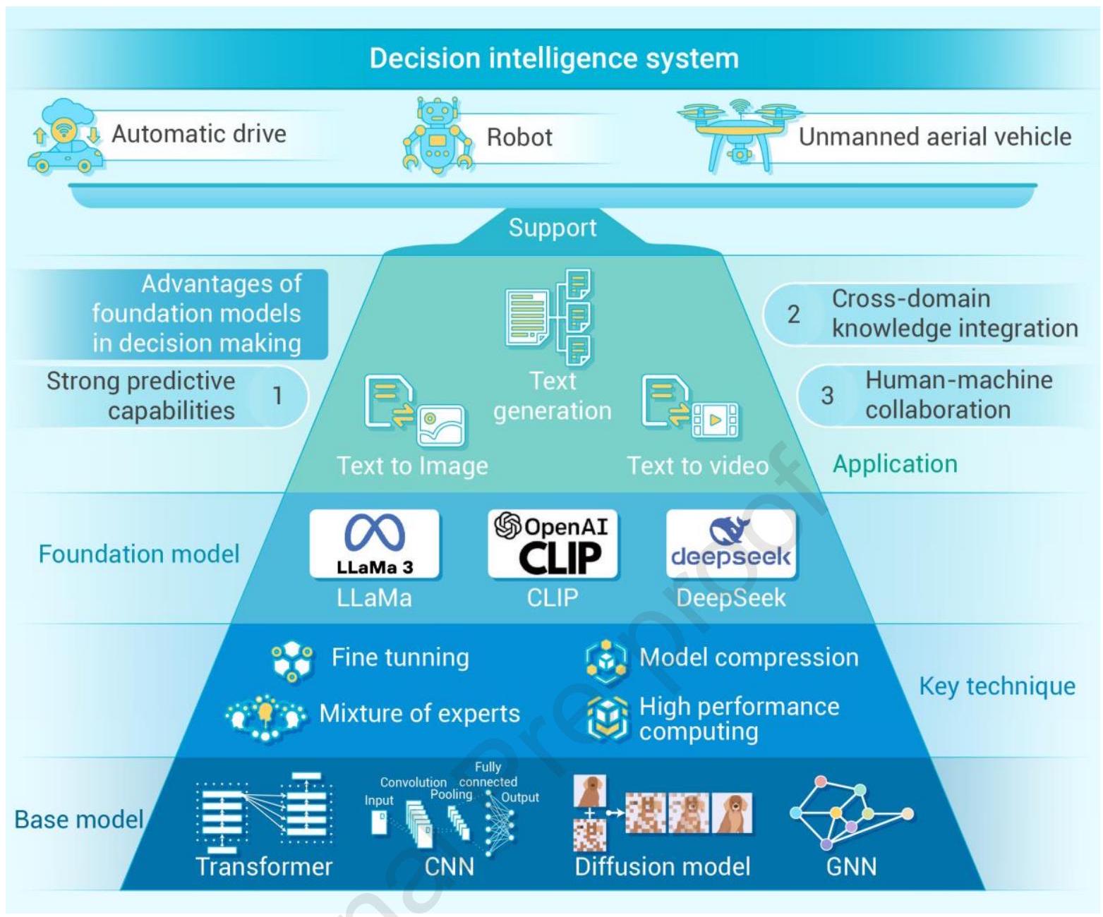基础模型(Foundation Models),如大型语言模型和多模态人工智能系统,因其能够处理并整合跨多领域的大量数据,已成为智能决策的强大工具。这些模型通过大规模数据集训练,擅长识别模式、生成洞见并提供情境感知的推荐,这对于在复杂动态环境中做出明智决策至关重要。凭借其广泛的知识和适应能力,基础模型可辅助从战略规划、风险评估到实时问题解决及个性化决策支持的多样任务。它们在决策框架中的整合提升了效率、准确性和可扩展性,使组织和个人能够应对以往难以解决的挑战。为更好地介绍基于基础模型的决策智能,本节将介绍基础模型的发展,具体包括基础模型的基础知识、大型语言模型(LLMs)及多模态基础模型的发展,最后介绍基础模型的优化。