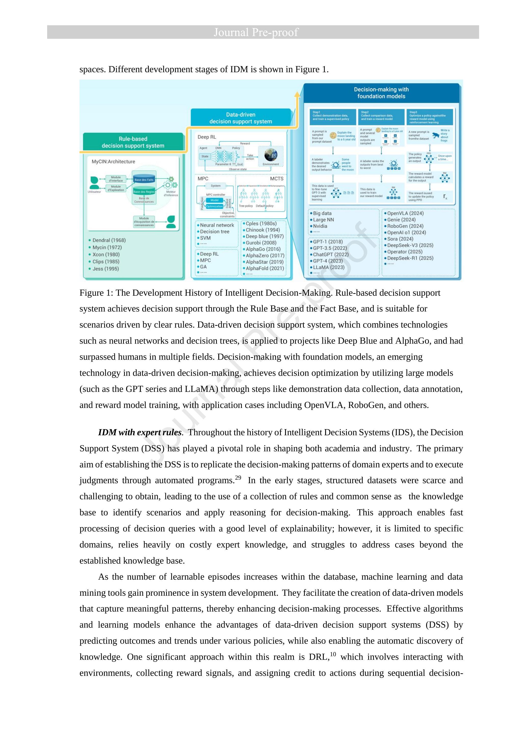 IDM与专家规则。智能决策系统(Intelligent Decision Systems,IDS)发展史上,决策支持系统(Decision Support System,DSS)在学术界和工业界均发挥了关键作用。建立DSS的主要目的是复制领域专家的决策模式,并通过自动化程序执行判断。\({ }^{29}\) 早期,结构化数据集稀缺且难以获取,因此采用规则集合和常识作为知识库,识别场景并运用推理实现决策。此方法能快速处理决策查询且具备良好解释性,但局限于特定领域,严重依赖昂贵的专家知识,且难以处理超出既有知识库的情况。