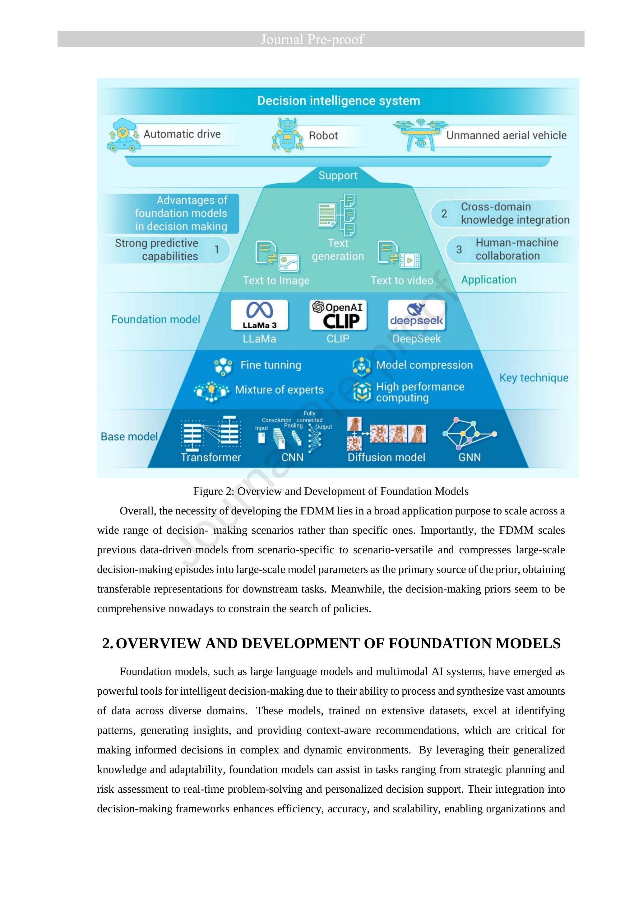 基础模型(Foundation Models),如大型语言模型和多模态人工智能系统,因其能够处理并整合跨多领域的大量数据,已成为智能决策的强大工具。这些模型通过大规模数据集训练,擅长识别模式、生成洞见并提供情境感知的推荐,这对于在复杂动态环境中做出明智决策至关重要。凭借其广泛的知识和适应能力,基础模型可辅助从战略规划、风险评估到实时问题解决及个性化决策支持的多样任务。它们在决策框架中的整合提升了效率、准确性和可扩展性,使组织和个人能够应对以往难以解决的挑战。为更好地介绍基于基础模型的决策智能,本节将介绍基础模型的发展,具体包括基础模型的基础知识、大型语言模型(LLMs)及多模态基础模型的发展,最后介绍基础模型的优化。