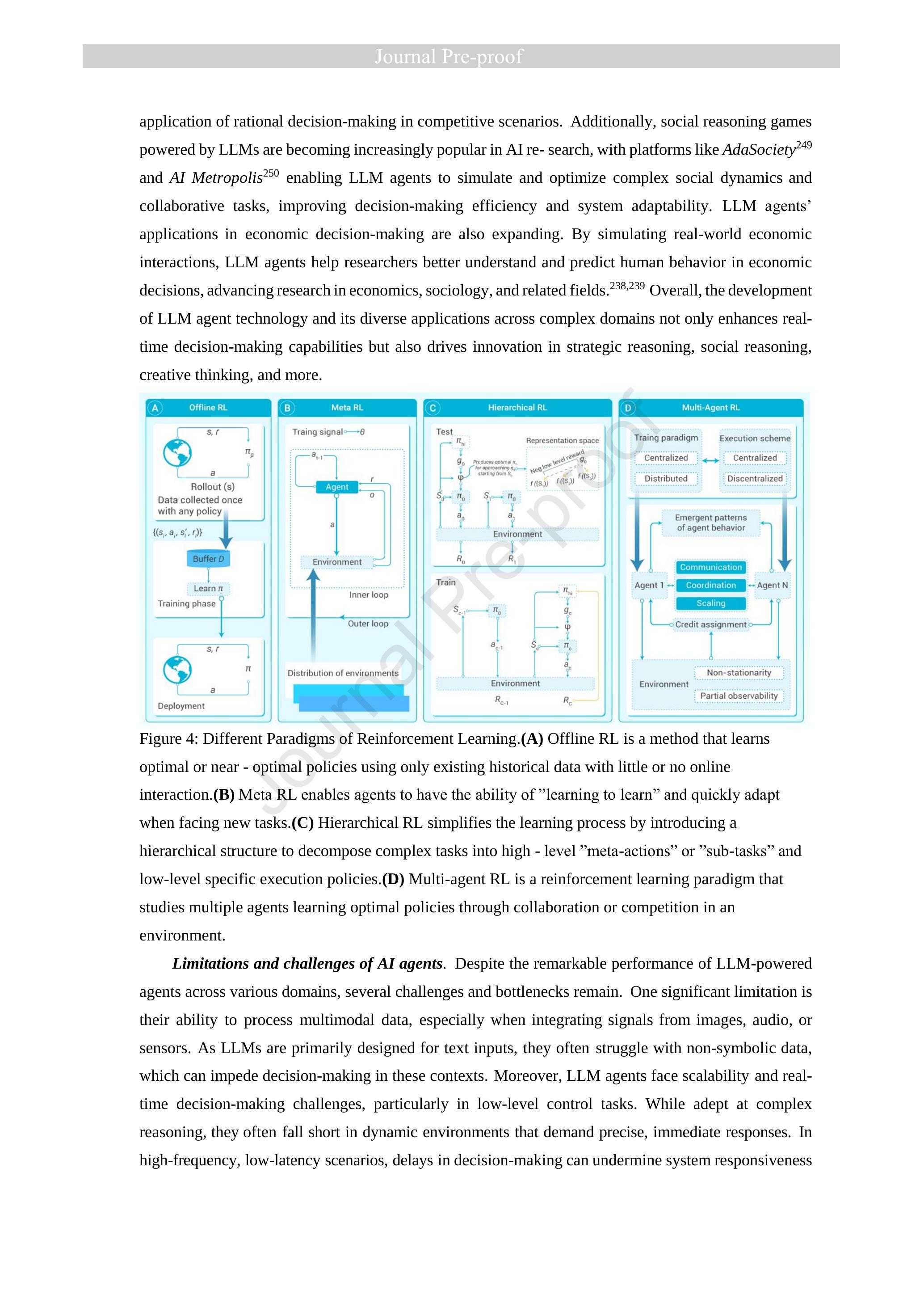 基于单智能体RL的进展,多智能体强化学习(MARL)将RL扩展至包含多个智能体的环境,智能体需通过合作或竞争进行交互。MARL带来非平稳性、信用分配和智能体间通信等新挑战,并通过多种训练和执行范式加以解决。\({ }^{38}\)