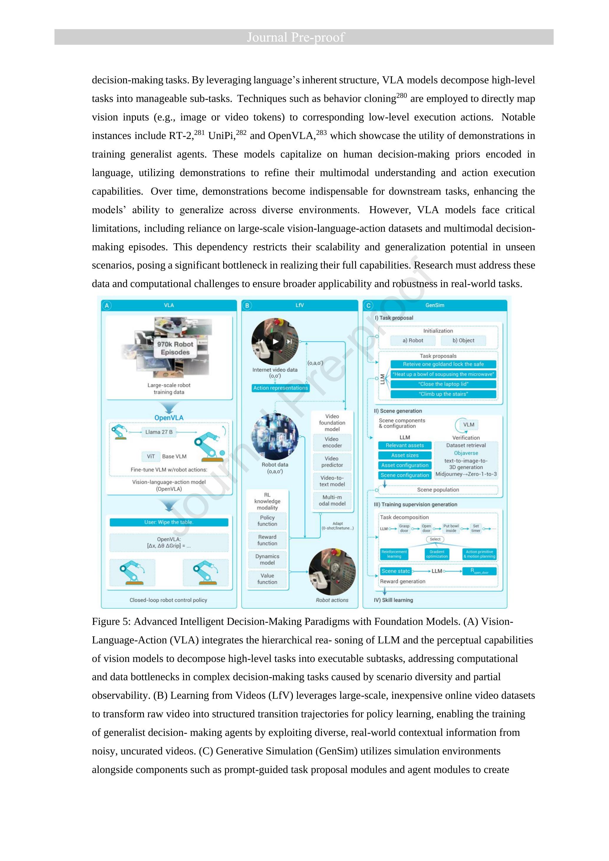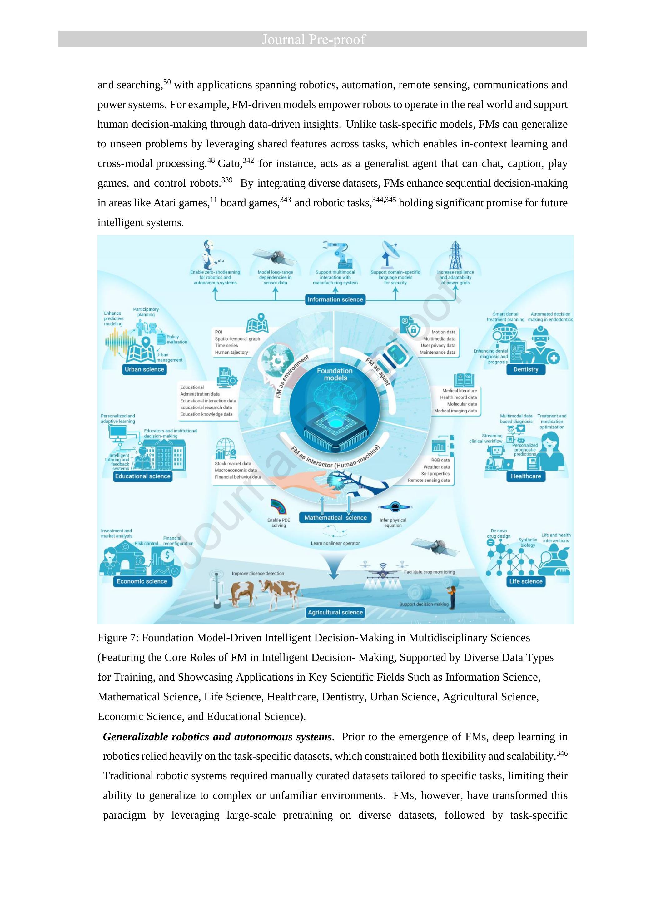 基础模型的应用已成为推动智能决策的重要基石。在基于知识的问答中,GPT \({ }^{61}\) 展现多样性响应能力,BERT \({ }^{59}\) 优于阅读理解,支持更准确、上下文感知的决策。在推理任务中,思维链(Chain of Thought, CoT)\({ }^{128}\) 通过提示中间推理步骤增强LLM复杂推理能力,显著提升算术、常识和符号推理表现。思维树(Tree of Thought, ToT)\({ }^{129}\) 进一步让LLM探索多条推理路径并评估选择,促进更强健自适应的推理。在自主系统中,LanguageMPC \({ }^{130}\) 将LLM作为决策者,通过结构化思维流程生成可执行指令,并与模型预测控制(MPC)等低层控制器无缝集成。LLM在多智能体系统的引入\({ }^{131}\) 促进代理间通信、推理与学习,提升复杂决策场景中的集体智能。医疗领域,ChatGPT在放射科临床决策辅助中的潜力已被评估,\({ }^{132}\) 展示LLM在高风险决策中的变革作用。类似地,将LLM整合至自动驾驶车辆,借助自然语言交互、上下文理解和持续学习,提升决策能力。\({ }^{133}\) Expel \({ }^{134}\) 提出一种代理,通过试错收集经验,提炼见解,并结合经验改进新任务决策,且无需更新模型参数,展现自适应经验驱动决策潜力。这些进展凸显基础模型在实现更准确、上下文感知和自适应决策中的关键作用,根本改变智能系统的运行及其与世界的交互方式。