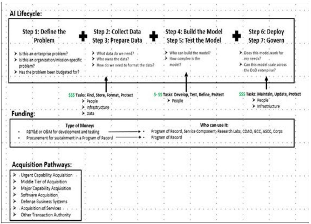 AI/ML 的整合同样资源密集,需要云技术访问、数据管理与高性能计算资源,导致训练成本上升,并且在野战条件下难以维持。例如,在作战环境中维持AI的可持续性受到带宽与算力等资源限制的挑战。本项目评估了国防部现行资金机制与资源分配模式的可行性。