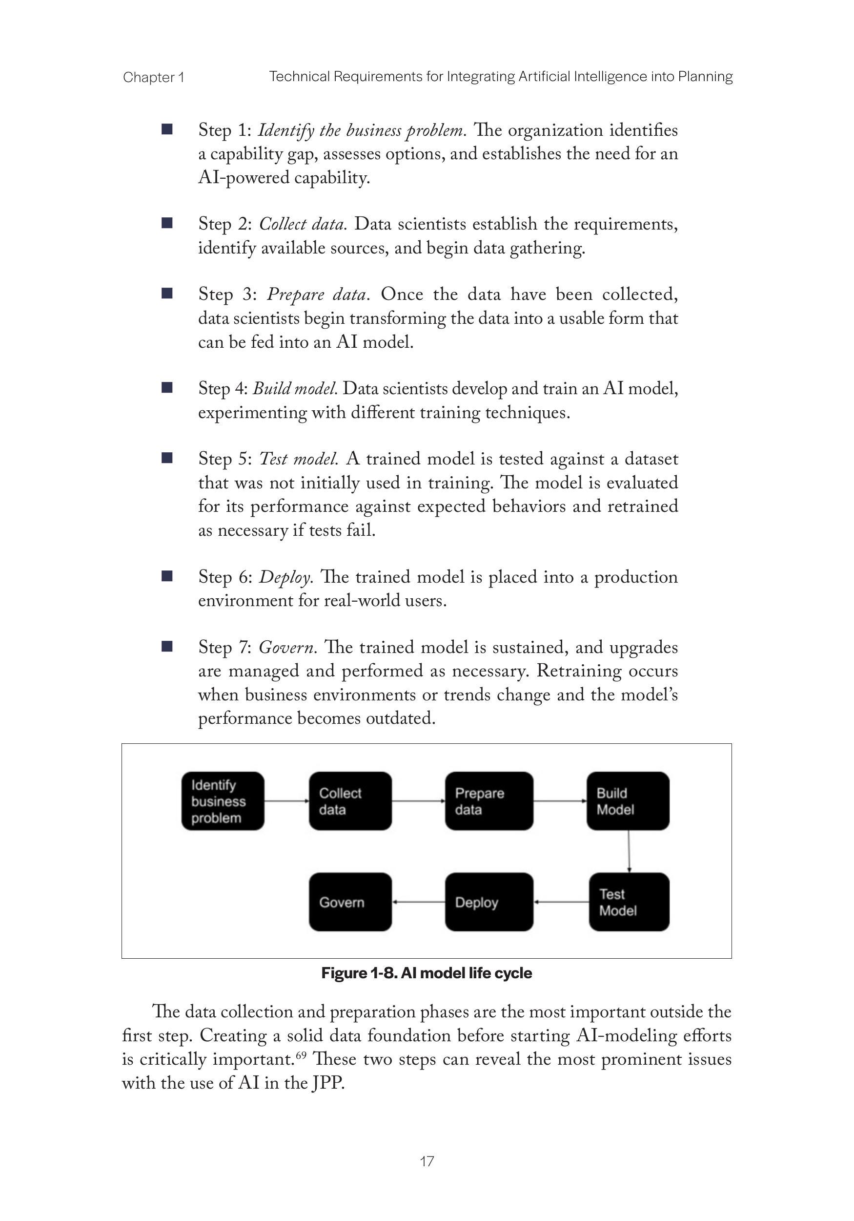 将\(\mathrm{AI}/\mathrm{ML}\)纳入联合规划流程(Joint Planning Process, JPP)的前提是理解新兴技术能做什么,不能做什么。对潜在益处的过高预期会扭曲困难的资源配置决策,并限制渐进性的成功。相反,预期管理对于成功且渐进地整合新系统至关重要,这意味着至少在初期要接受AI在塑造部队通用作战图或制定行动方案时只能发挥有限作用。从技术角度,国防部可采取以下四个具体步骤开始将AI作为规划工具进行整合: