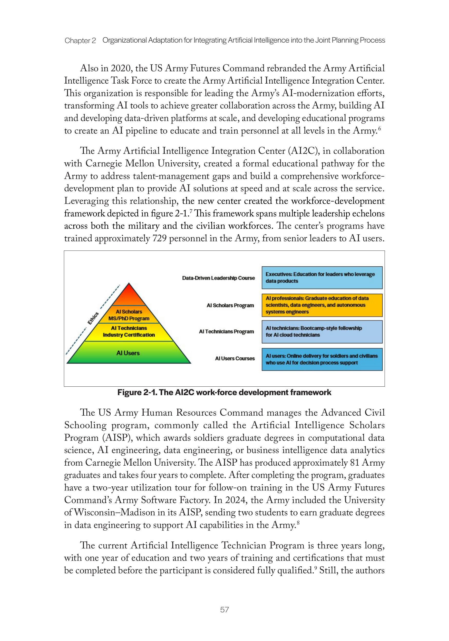 2021年,《国家安全人工智能委员会报告》(National Security Commission on Artificial Intelligence Report)发布,提出多层次国家安全AI战略,包括加速AI在防务与安全任务中的应用、建设AI人才队伍及保持美国AI技术优势。\({ }^{21}\) 报告建议国防部应“在2025年前建立AI广泛整合的基础”,包括建设统一的数字基础设施、培养数字素养军队,并从不适配AI的传统系统中战略性退出。\({ }^{22}\) 报告强调:“五角大楼领导层必须立即推动组织改革。”\({ }^{23}\)
