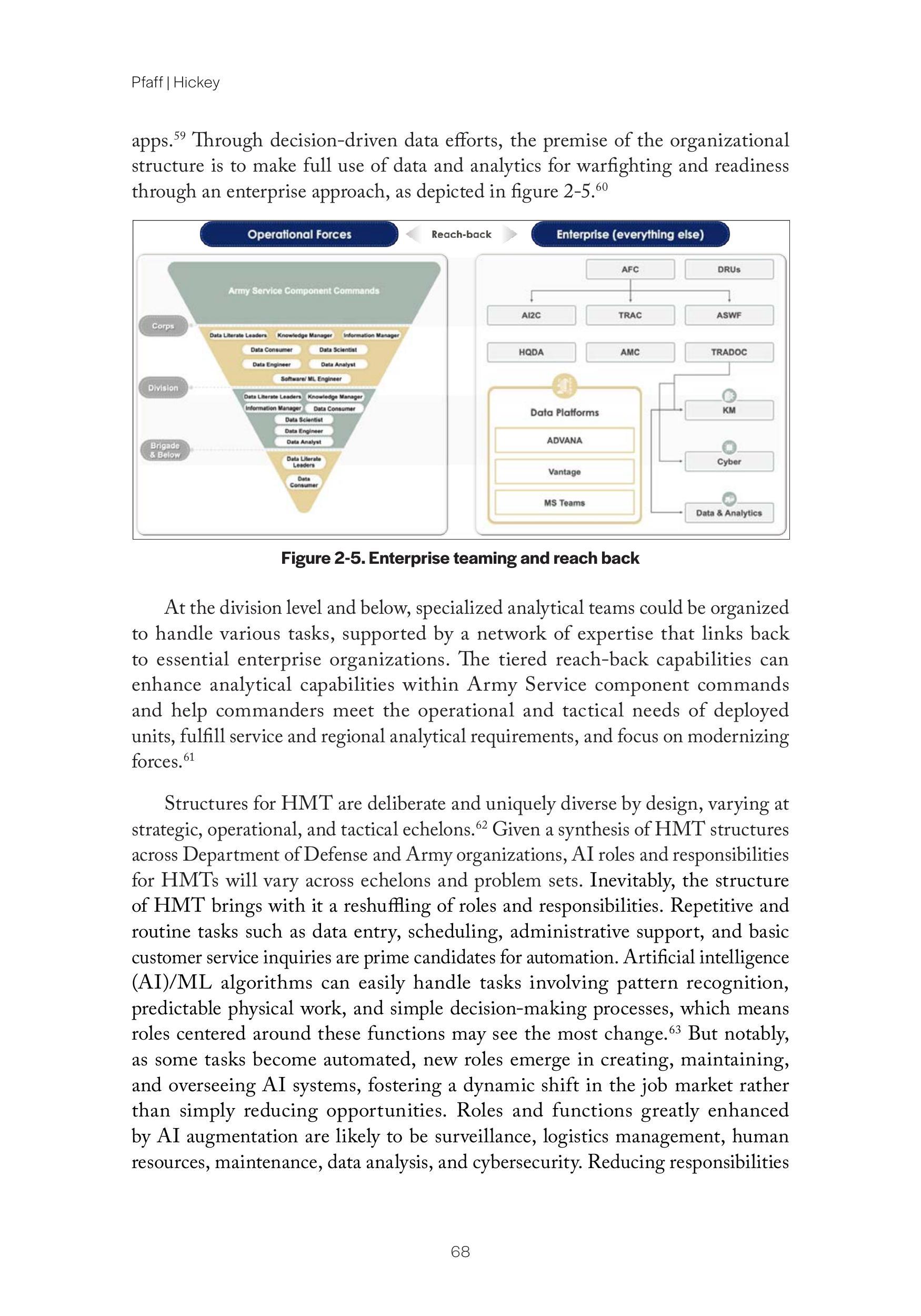 美国国防部(DoD)在自上而下与自下而上的两个层面都进行了AI/ML的整合。机构层面的AI整合始于2018年,当时国防部成立了联合人工智能中心(Joint Artificial Intelligence Center, JAIC),并发布AI战略,强调加速AI的采用与整合,以保持战略与作战优势。\({ }^{13}\) 正如本研究所指出的,与产业界的合作及其融入军事行动的机制将是AI成功采用的关键,同时还需建立一支具备技术素养的部队。AI战略最重要的成果之一是成立JAIC这一专责机构,以统筹国防部内的AI整合工作。