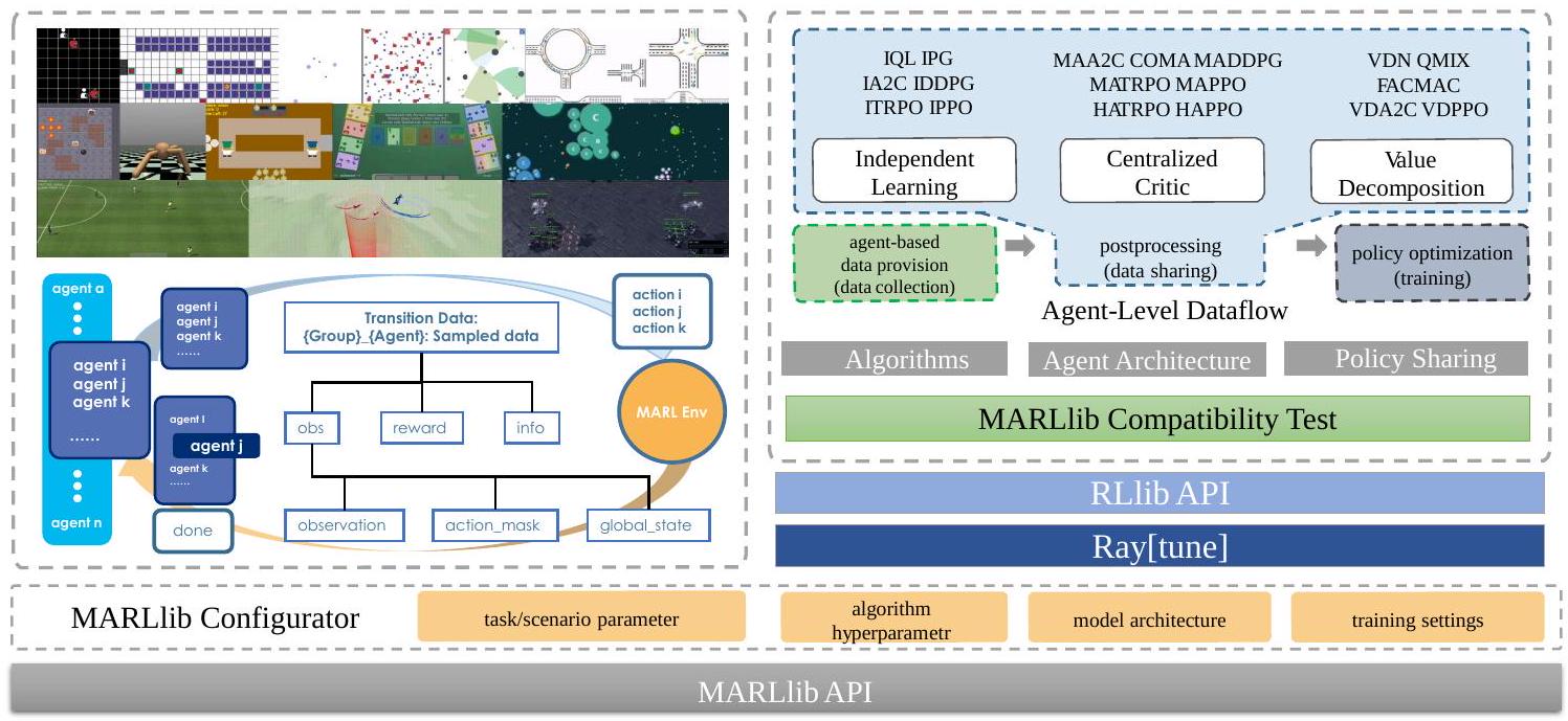 图1:MARLlib概览——一个将算法与任务集成到统一框架中的框架。