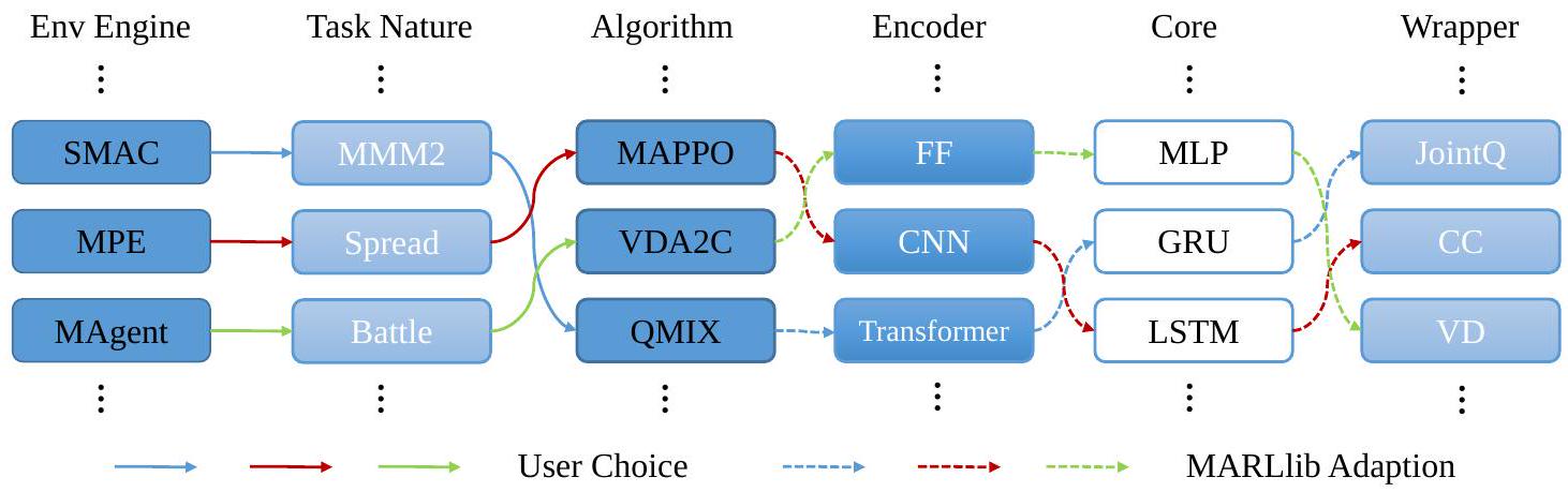 图2:数据流始于用户选择一个任务和算法来运行。MARLlib随后会在剩余的学习流程中自动适配所需模块。值得注意的是,MARLlib的模块化设计使得其能够自动选择和组合更小的模块组件,从而提升学习流程的整体适应性与效率。