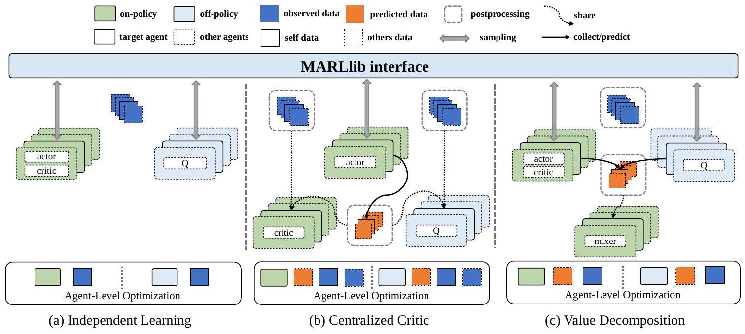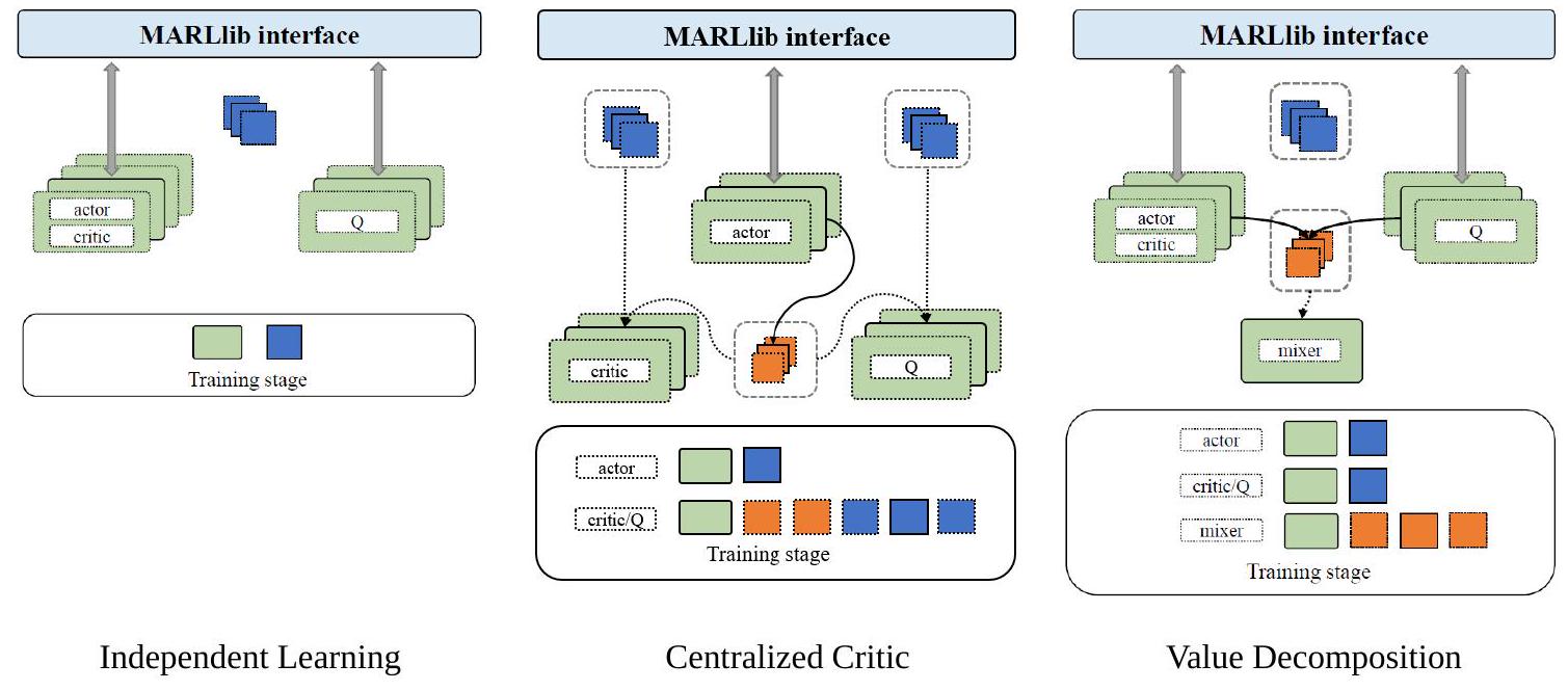 图5:MARLlib在独立学习、集中式评价器和价值分解中的学习流程。