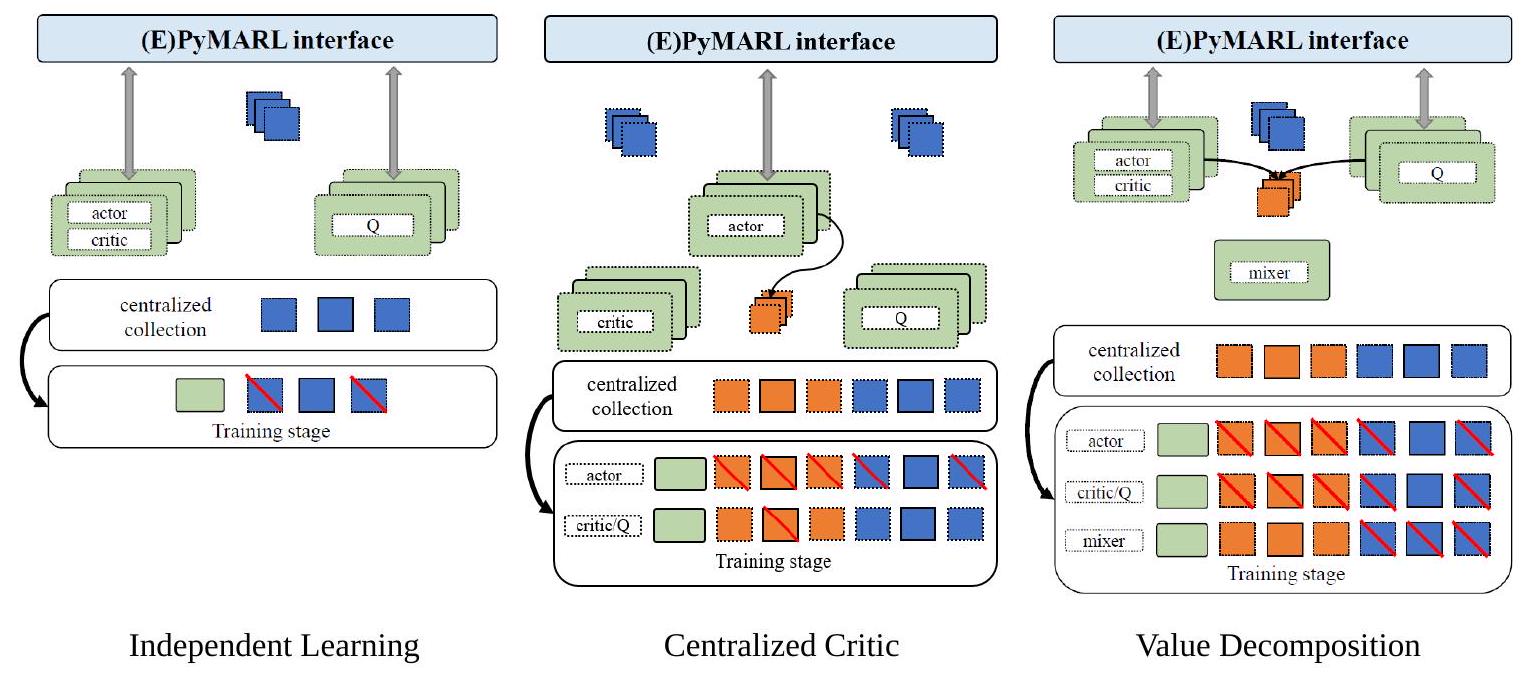 图4:(E)PyMARL在独立学习、集中式评价器和价值分解中的学习流程。请注意,为了更好地展示,训练阶段仅绘制了一个智能体,这并非(E)PyMARL的真实情况,因为所有智能体应当同时训练。