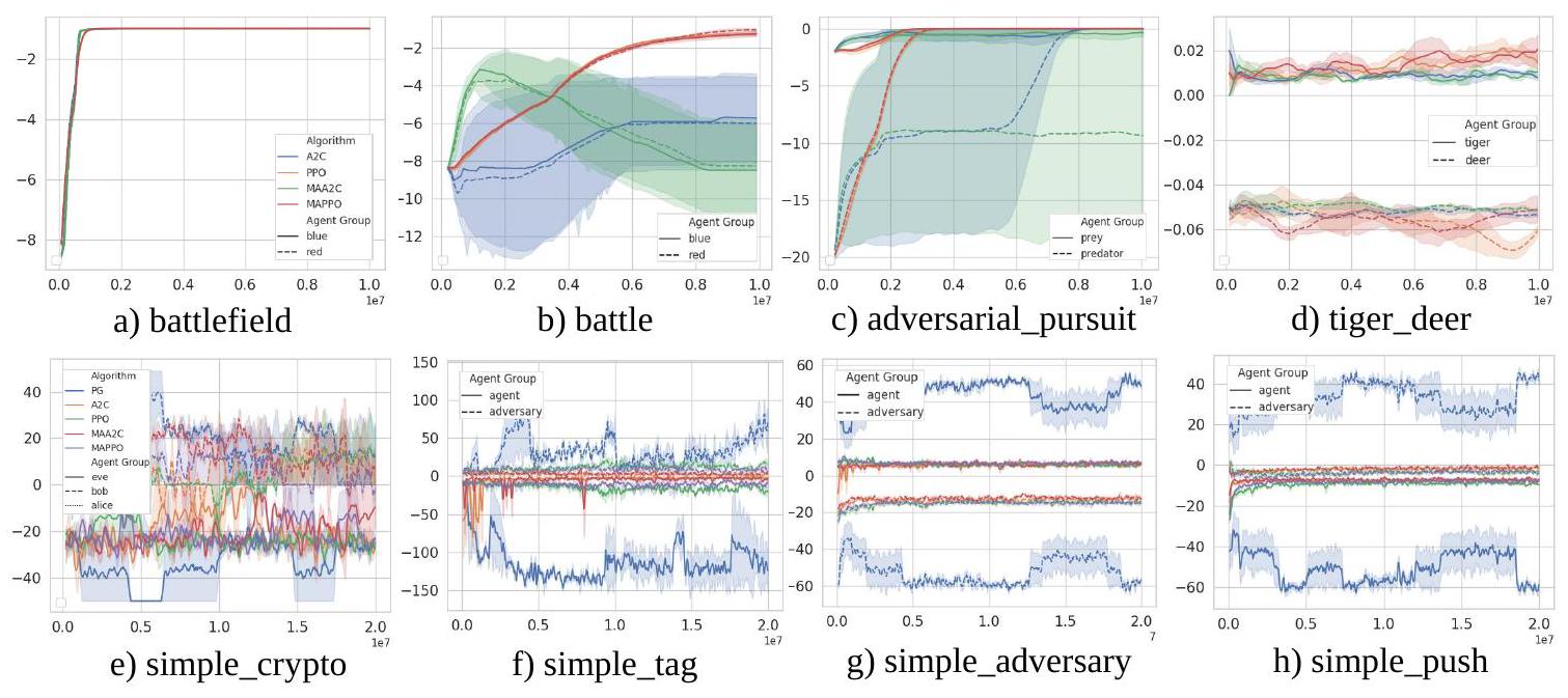 图6:图中展示了8个混合场景的回报曲线,其中智能体以小组形式竞争,来自MAgent环境的四个场景(a-d)和MPE环境的四个场景(e-h)。每条曲线对应一个不同的智能体组。竞争组的回报曲线在学习过程中呈现出动态平衡,平衡点因算法与任务的不同而有所变化。为便于观察,图中进行了放大,以突出学习过程的细节。