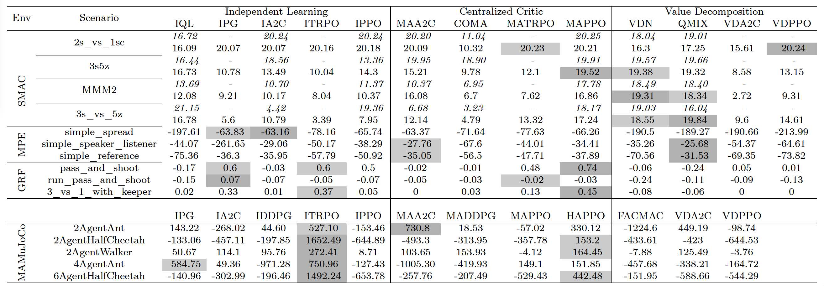 表4:算法在合作任务上的性能表现(以回报衡量),覆盖了离散控制任务(MPE、SMAC、GRF)和连续控制任务(MAMuJoCo)。评估包含四个环境套件,其中SMAC的每个场景有两行:第一行(斜体)为EPyMARL报告的性能,第二行为使用MARLlib得到的性能。对于其他环境,仅包含MARLlib的结果。表格中“-”表示该场景未报告数据。深色单元格表示该场景下的前两名表现。