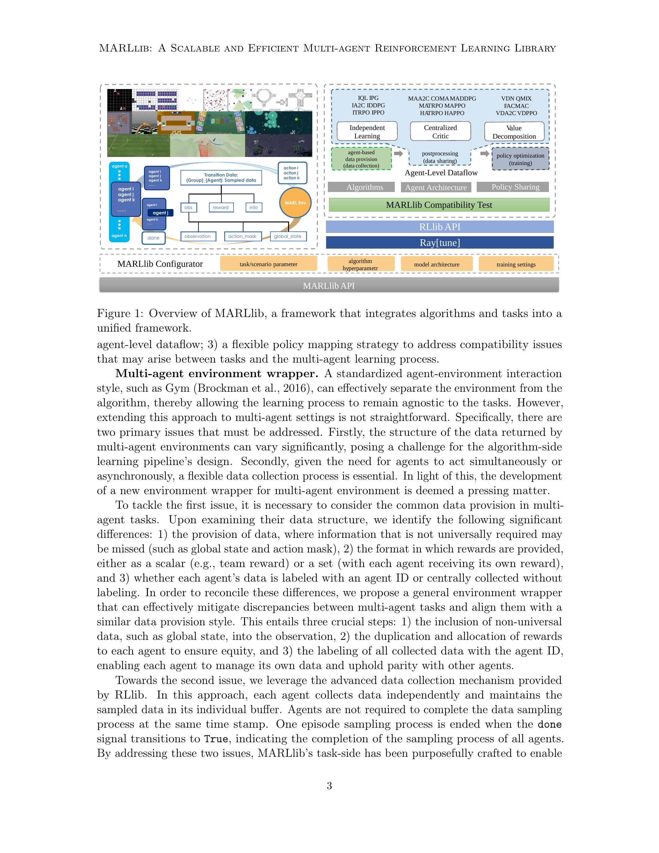 图1:MARLlib概览——一个将算法与任务集成到统一框架中的框架。