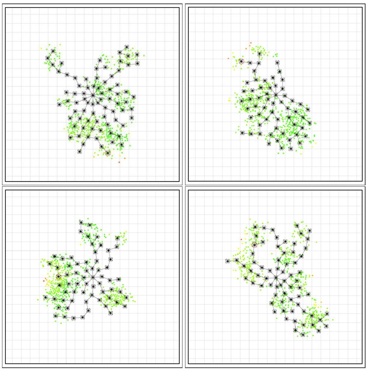 此外,结果还表明:蜂群中所有成员并行执行各自的决策函数(决定节点位置)能够生成一个稳定或近乎稳定的网络配置,只要客户端的分布保持静止(即实现成功的自组织)。多数参与的无人机会在固定位置附近“振荡”,并在树状拓扑中长期保持相同的角色/层级。