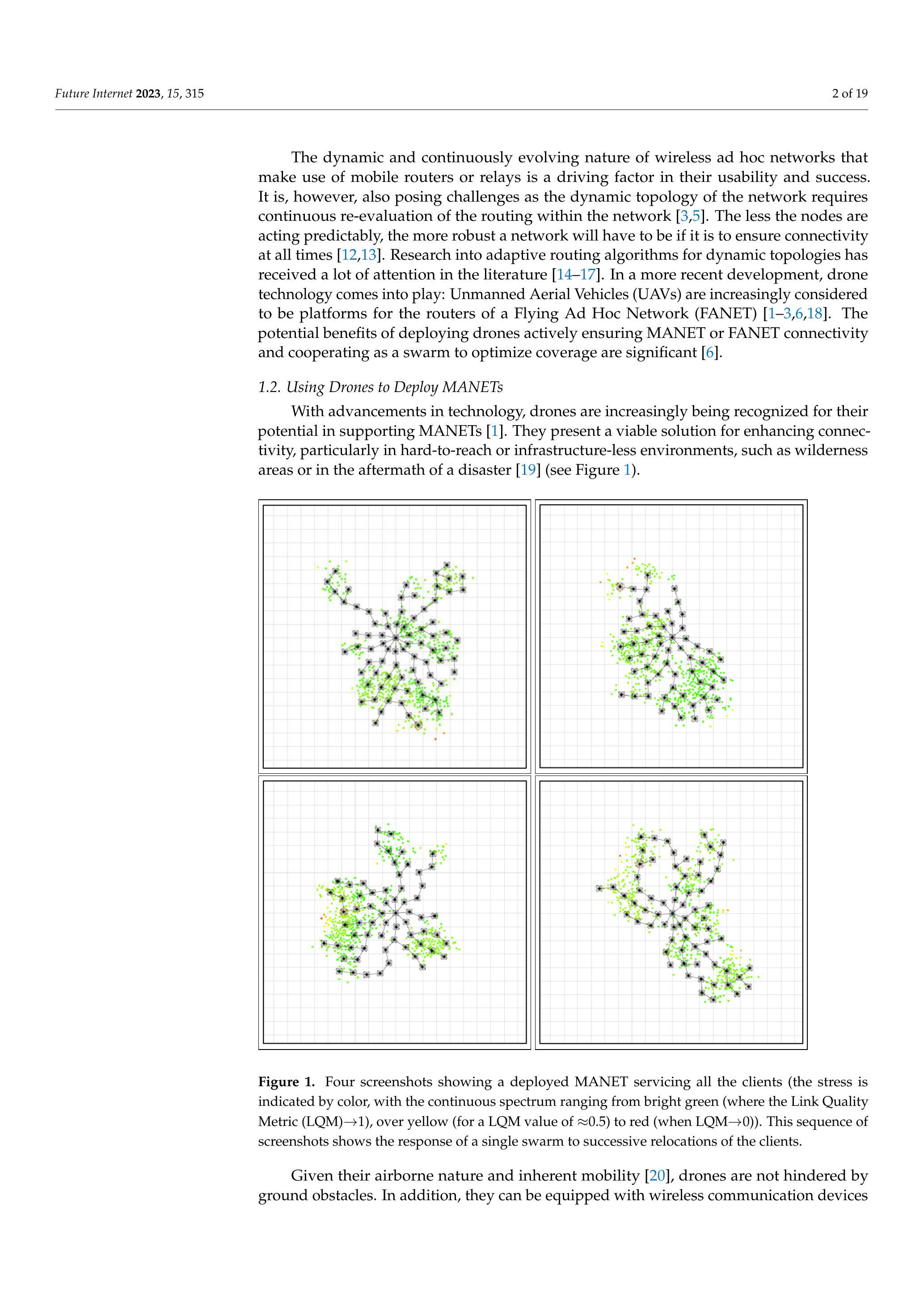 无线自组网络的动态性和持续演化特性,使得基于移动路由器或中继器的应用具有很强的实用性和成功潜力。然而,这也带来了挑战,因为网络的动态拓扑结构要求对路由进行持续的重新评估 [3,5]。节点的行为越不可预测,网络就必须越健壮,以确保在任何时候都能维持连接 [12,13]。针对动态拓扑的自适应路由算法研究已经在文献中得到了广泛关注 [14-17]。在最近的发展中,无人机(Unmanned Aerial Vehicles,UAVs)技术开始进入这一领域:UAVs 越来越多地被视为飞行自组网络(Flying Ad Hoc Networks,FANETs)中的路由器平台 [1-3,6,18]。积极利用无人机来保障 MANET 或 FANET 的连通性,并以蜂群方式协同优化覆盖范围,潜在收益是巨大的 [6]。