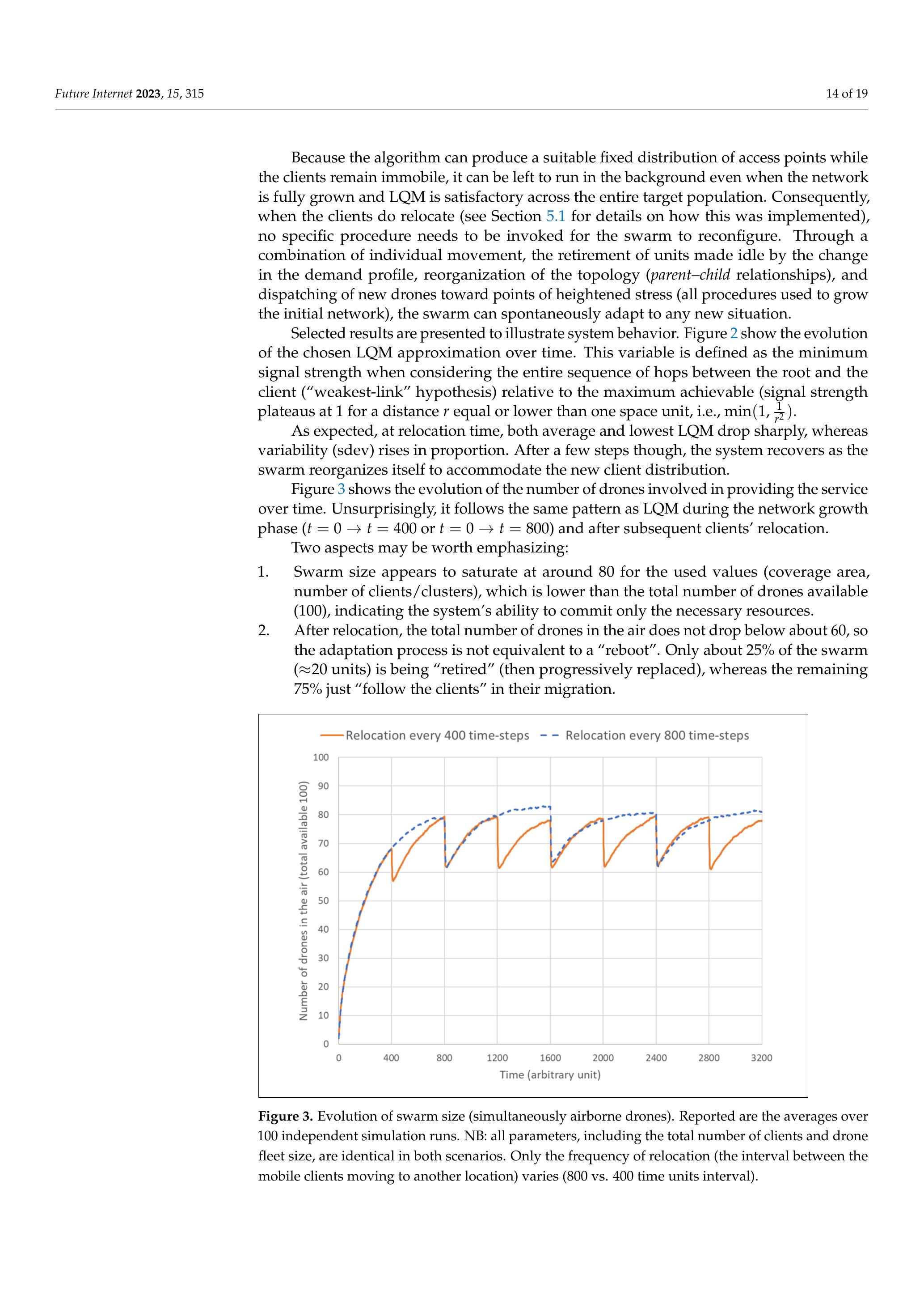 结果显示,在客户端重定位时,平均 LQM 与最低 LQM 均急剧下降,而方差(标准差)则成比例上升。但在经过几个时间步后,系统会恢复,因为蜂群已重新组织以适应新的客户端分布。