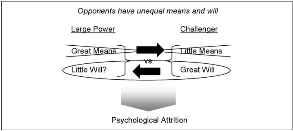 在近期冲突中,情况则有所不同。一方(强国,great power)通常拥有强大手段但意志有限,原因往往是冲突未直接威胁其本土。相较之下,另一方(地方势力或叛乱组织,local power or insurgency)手段有限但意志坚定(见图2)。这产生了两种不同的非对称性:手段的非对称性与意志的非对称性。由于成功作战在很大程度上关乎创造并利用非对称性,强国通常通过发动物理消耗竞赛来发挥其优势,迅速摧毁对手相对薄弱的物理手段。而规模较小或非国家行为体(non-state)的对手无法在此领域有效竞争,便转而利用其自认为在意志方面的优势,推行一种针对强国意志实施心理消耗(psychological attrition)的损害施加战略,具体而言即针对支持冲突的公众共识。\({ }^{15}\) 然而,只要此类挑战者能够以某种方式最大限度减少对可被瞄准手段的依赖——例如将叛乱分子与游击队混入当地民众之中——他们便能在很大程度上抵消强国的物理消耗努力,迫使对方陷入一场聚焦于心理消耗的基于效果的战争。