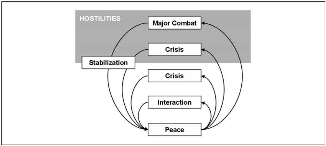 新型模型反映了一种竞争与冲突的连续体(见图5)。在此连续体上,“平时”行动涵盖一国为创建与维持基本威慑所付出的全部努力——此类行动从单纯维持与展示特定军事力量组合或配置(如前沿存在),到战略核威慑,再到如今对化学、放射性及生物大规模杀伤性武器的威慑,以及种类繁多的维和与人道主义行动所承担的全部责任。在此模型中,从和平到危机再到战争的过渡不仅趋于模糊,且过渡本身的不精确性已成为非对称对手可资利用的脆弱性缝隙。\({ }^{23}\) 沿此连续体,我们仍可识别危机的开端\({ }^{24}\),并确定我们决定应对新兴挑战或在危机响应行动中投入军事力量的时刻。然而,在面临非对称恐怖主义与游击挑战的世界中,敌对行动开始的节点远非清晰,往往位于执法力量应对犯罪行为与军事力量应对武装攻击之间的灰色地带。\({ }^{25}\) 在9·11后的安全环境中,线性的“战争状态”已被复杂的“敌对状态(state of hostilities)”所取代,后者囊括从执法到维和、军事力量的有限打击行动、全面军事干预,以及漫长的冲突后稳定行动(post-conflict stabilization operations)。在此敌对状态下,我们通常仍可识别重大作战行动的起止点(图5中阴影区块),部分原因在于其涉及常规军事行动,部分原因在于行动规模。但重大作战行动的结束不再意味着敌对行动的终结。相反,对手将在常规力量对抗中遭遇失败后“适应”并转向另一种冲突形式,继而持续转换敌对形式,直至其选项耗尽或意志崩溃。\({ }^{26}\) 鉴于这一9·11后新型模型所具有的非线性复杂适应系统(complex adaptive systems)本质,“冲突后稳定行动”往往演变为漫长循环序列,最终如T.S.艾略特所言,“非轰然巨响,而仅一声呜咽”告终,\({ }^{27}\) 其终结或许仅能在长期敌对缺失的回溯中,或某种可接受的不稳定常态中变得明晰——图中又一朵云彩。