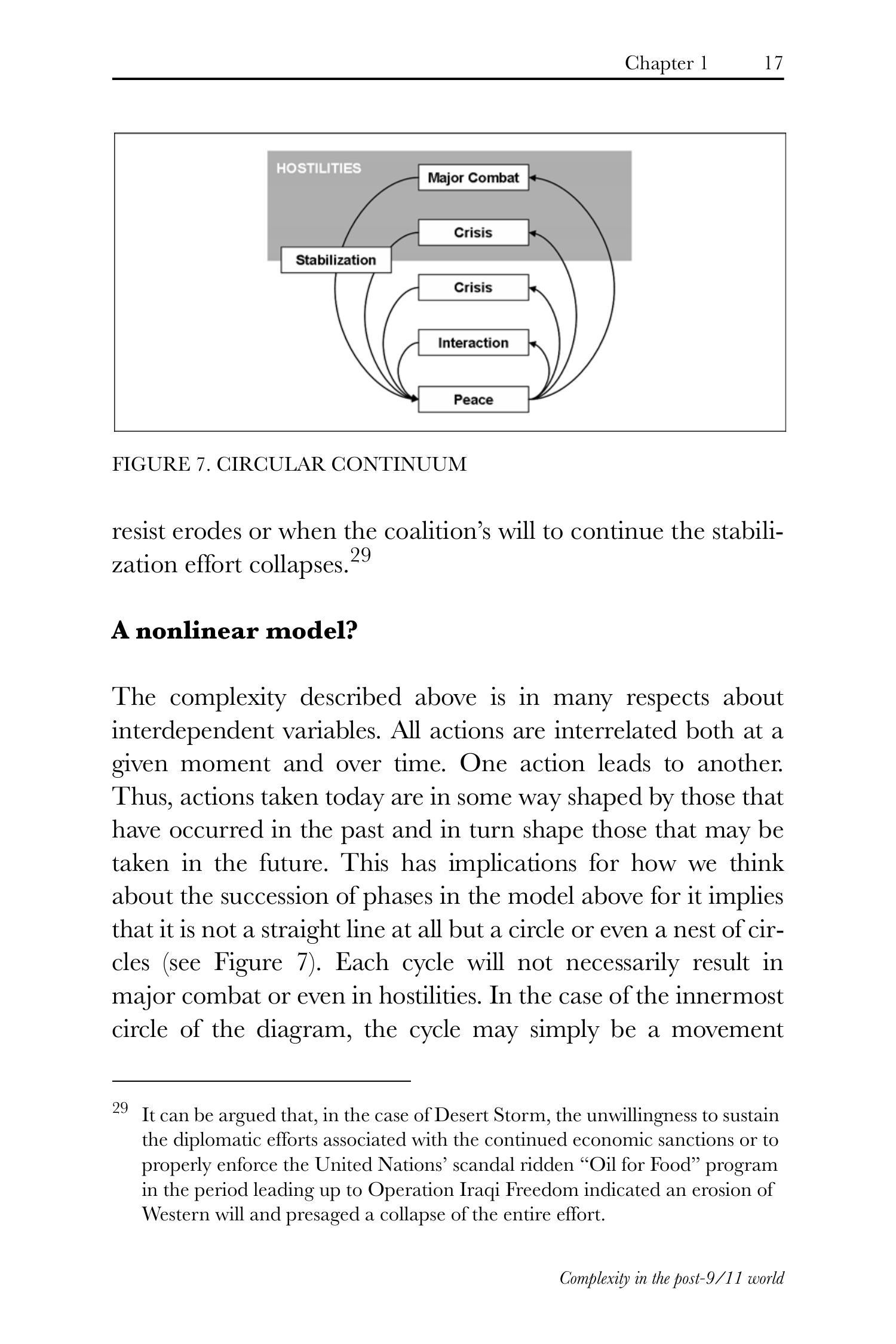 上述复杂性在诸多方面体现为相互依存变量(interdependent variables)的特性。所有行动不仅在特定时刻相互关联,且在时间维度上亦彼此关联。一个行动引发另一个行动。因此,今日采取的行动在某种程度上受过往行动所塑造,同时亦将塑造未来可能采取的行动。这对我们在思考前述模型中各阶段的演替方式具有启示意义——它意味着该模型根本不是一条直线,而是一个圆圈,甚至是一组嵌套的圆圈(见图7)。每个循环未必导致重大作战,甚至未必引发敌对行动。就图中最内层圆圈而言,该循环可能仅体现为从和平状态转向某种形式的互动,例如通过军事存在或外交接触强化稳定的威慑机制(deterrence regime)。或者,如向外一层的圆圈所示,它可能体现为对某种危机——人道主义、经济、政治或军事危机——的反应,继而再次回归和平。这些循环亦可反映如再外一层所示的危机:该危机跨越至某种敌对行动形式,但所涉军事行动未达到重大作战行动的规模,或体现于危机响应本身,或体现于危机后稳定行动(post-crisis stabilization operations)中。最后,在最外层圆圈中,该循环可能包含深入敌对区域的重大作战行动。