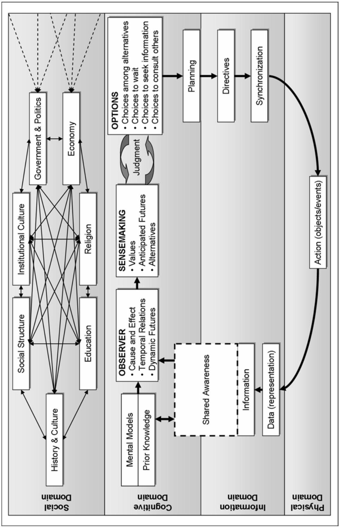 \({ }^{124}\) 共享态势感知部分归属于认知域,原因有二:首先,传感器(sensors)及其处理流程——无论属于精心策划的监视系统抑或简单临时安排——均将以某种方式过滤报告,致使进入态势感知的内容成为实际事件的某种变体。因此,实际进入态势感知的内容取决于认知决策:支持何种数量与类型的传感器或报告者、其部署位置、组织方式与报告机制。其次,为影响行为,态势感知中所蕴含的刺激源必须被人类决策者看到、听到或感知到,无论该系统是如主要国家般庞大而多元的社会,抑或如恐怖细胞(terrorist cell)般微小而专注的群体。
