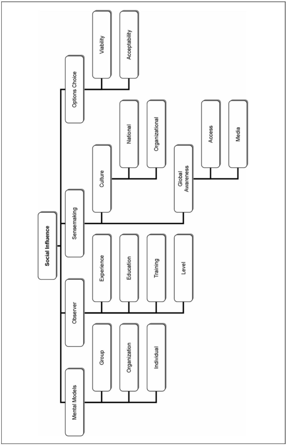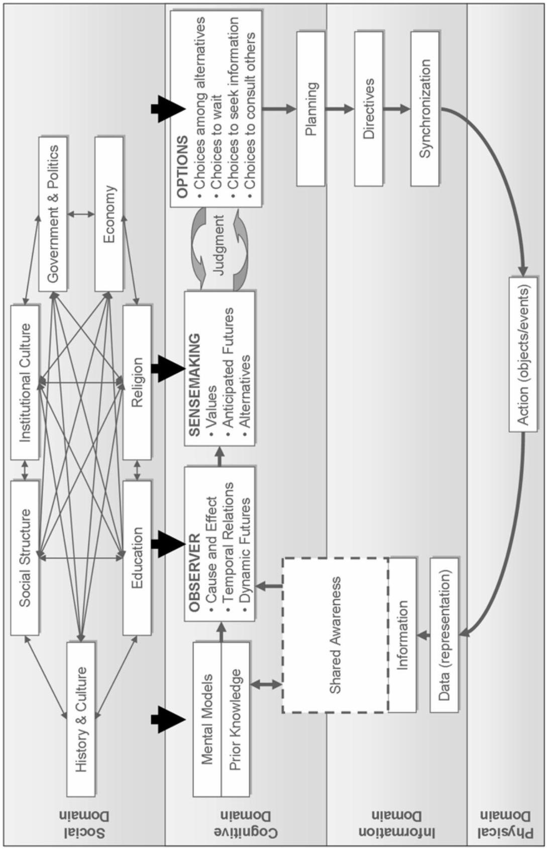 第一交叉点为心智模型(mental model)——用于情境化态势感知的类比库(analogy library)或逻辑框架(logical framework)。该框架反映社会的价值观与自我形象(self-image),及其对环境的共享认知与对未来的愿景与预期。\({ }^{127}\) 因此,所形成的心智模型必须既与此社会背景保持一致,亦能提供足够详尽的解释以支撑意义建构(sensemaking)及认知决策流程的其余环节。