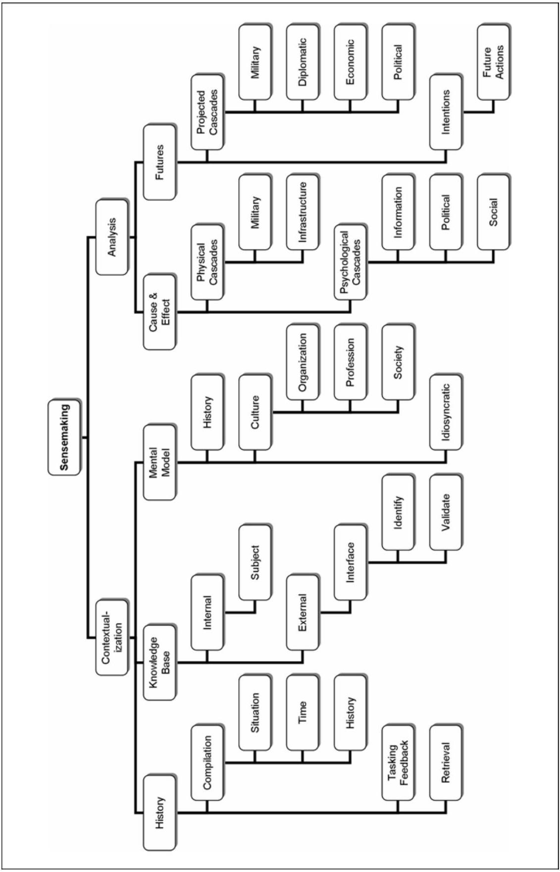 意义建构(sensemaking)流程将态势感知生成推进至下一阶段。它开始对刺激源进行回溯性分析——将任何行动置于先前行动的背景中,并置于一条或多条假定的逻辑因果链(cause-and-effect chains)中;同时进行前瞻性推断——推断这些链条或交互看似导向何方,以及对未来意味着什么。\({ }^{135}\) 换言之,该流程包含两个主要子流程:情境化(contextualization)与分析(analysis)。此种意义建构及其子流程可能体现为军事指挥机构有意识组织自身以应对问题的正式流程,亦可能体现为个体应对紧迫态势时主要在潜意识层面进行的流程。与其他基本流程相同,可用于决策的时间越短,实时意义建构越可能在观察者或决策者头脑内部进行,而非通过正式参谋流程完成。