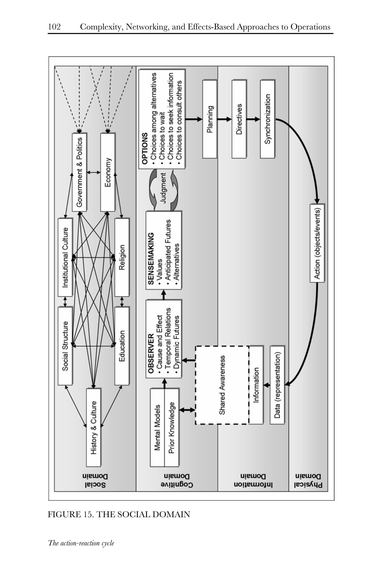 然而,上述循环仍有所缺失。该循环描述了人类及人类组织一般如何决策与行动,换言之,它反映了人类行为中源于生物进化与早期社会学进化的一面。这是一种"理性人"(rational man)或"理性行为体"(rational actor)的概括,可能无法完全适用于手头情境,当应用于非对称性、非西方对手时尤成问题——传统(通常基于西方)模型的若干基本假设对其可能并不成立。此论断并非意指非西方或非对称行为体的行为是非理性的(此种情况实属罕见),而是指其所采用的理性逻辑未必能在其自身社会与认知背景之外被理解。例如,将奥萨马·本·拉登(Osama bin Laden)视为非理性狂热分子或许颇具诱惑力,但此种结论将使我们无法边界限定或理解其行为;相反,尝试从其视角理解该行为(无论其表象何等深奥),方能为我们提供边界限定该行为可能走向并予以应对的手段。对于基于效果的行动方法,我们不仅需知晓人类一般可能如何行动,亦需了解特定个体或群体的反应如何区别于他者。为此,我们需在前述图示所示的物理域、信息域与认知域之外,增加一个社会域(social domain)\({ }^{125}\)(见图15)。