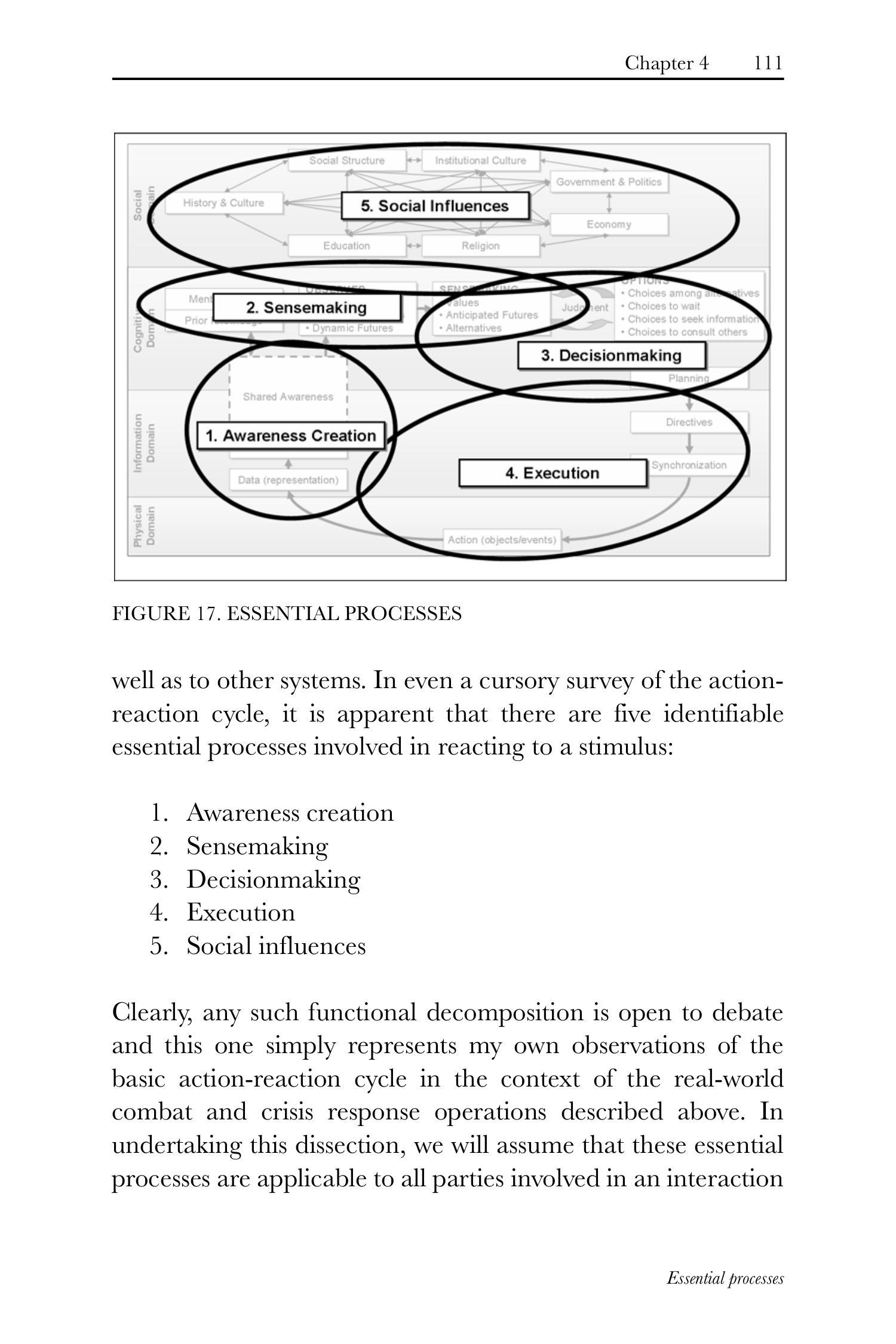 显然,任何此类功能分解(functional decomposition)均存在讨论空间,此处所呈现的仅是我基于前述真实世界作战与危机响应行动背景下对基本行动-反应循环(action-reaction cycle)的个人观察。在进行此项解剖时,我们假定这些基本流程适用于交互中所有参与方,因而既反映对对手基本流程的评估,亦反映对我方自身流程的评估。\({ }^{130}\)