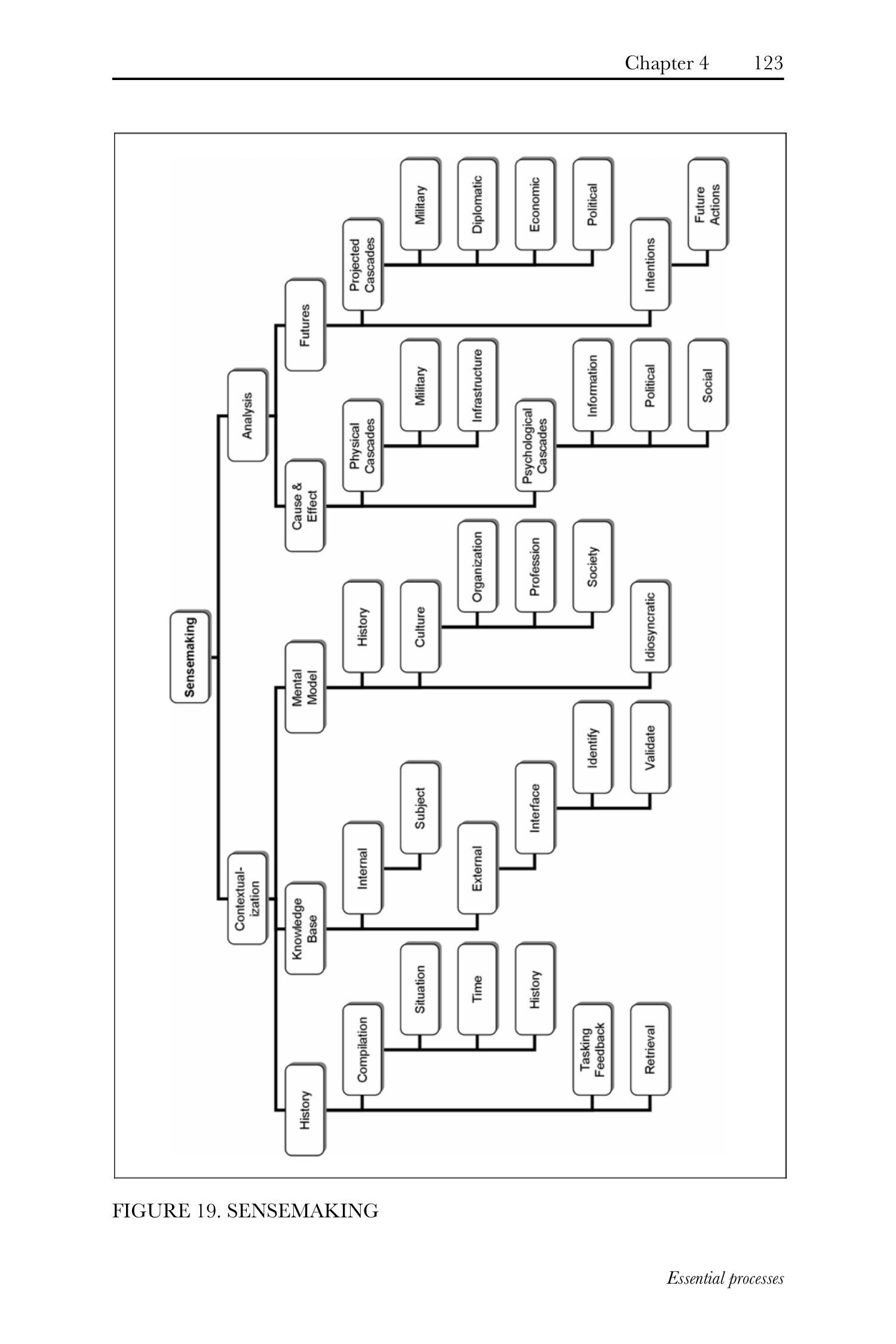 意义建构(sensemaking)流程将态势感知生成推进至下一阶段。它开始对刺激源进行回溯性分析——将任何行动置于先前行动的背景中,并置于一条或多条假定的逻辑因果链(cause-and-effect chains)中;同时进行前瞻性推断——推断这些链条或交互看似导向何方,以及对未来意味着什么。\({ }^{135}\) 换言之,该流程包含两个主要子流程:情境化(contextualization)与分析(analysis)。此种意义建构及其子流程可能体现为军事指挥机构有意识组织自身以应对问题的正式流程,亦可能体现为个体应对紧迫态势时主要在潜意识层面进行的流程。与其他基本流程相同,可用于决策的时间越短,实时意义建构越可能在观察者或决策者头脑内部进行,而非通过正式参谋流程完成。