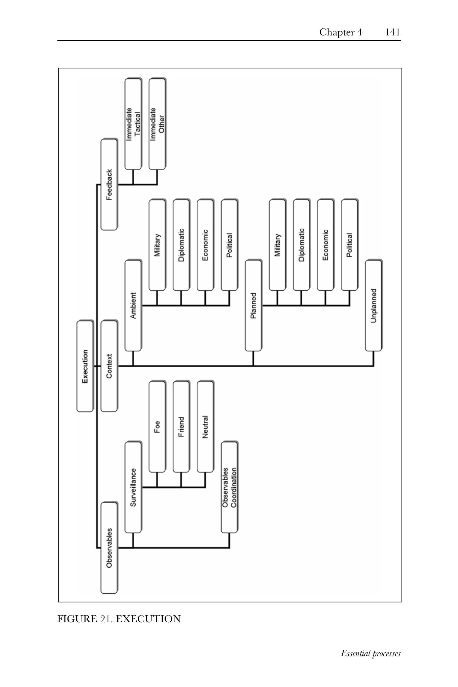 某种意义上,分解为基本流程(essential processes)与子流程(subprocesses)提供了一种通用逻辑树(generic logical tree),我们可借此开始梳理基于效果行动的"如何实施"(how to)问题。此外,此逻辑树的实用性并不局限于军事行动,正如基于效果的行动本身亦不能仅限于其军事维度。这些流程与深度剖析(drill-downs)同样适用于国家与国际恐怖组织,适用于外交、经济与政治领域以及军事领域,亦适用于民间世界与政府领域。简言之,它们应能通过某种外推(extrapolation)适用于复杂人类交互的广泛范畴。