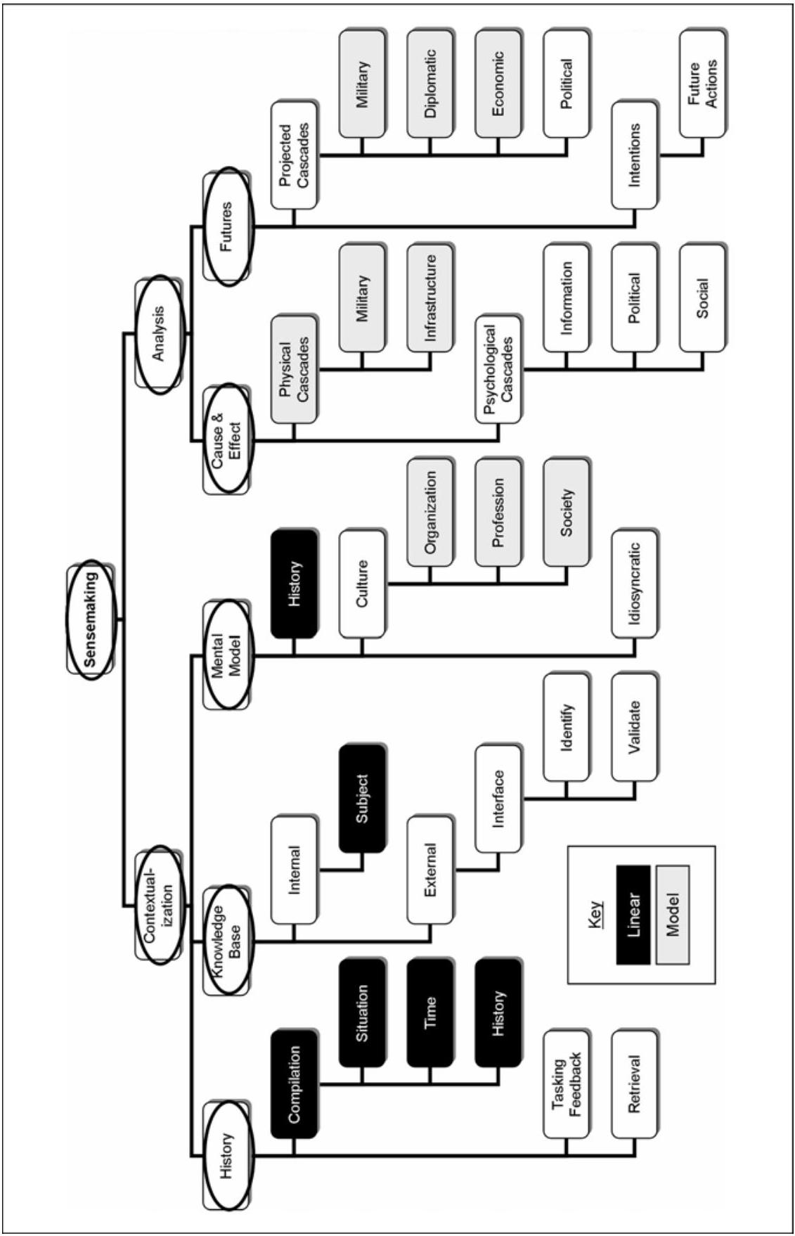 由此引申,对联合特遣部队意义建构的最大单一影响因素,很可能在于详尽综合性数据与知识库的可用性。知识库越完善、颗粒度越精细,决策者的判断与评估便越能被有效限定。无论在特遣部队内部抑或外部(例如在作战净评估(Operational Net Assessment)中)开发与维护此类知识库,均为信息工具、分析工具、建模工具以及主题领域专业知识的引入提供了多重机遇。