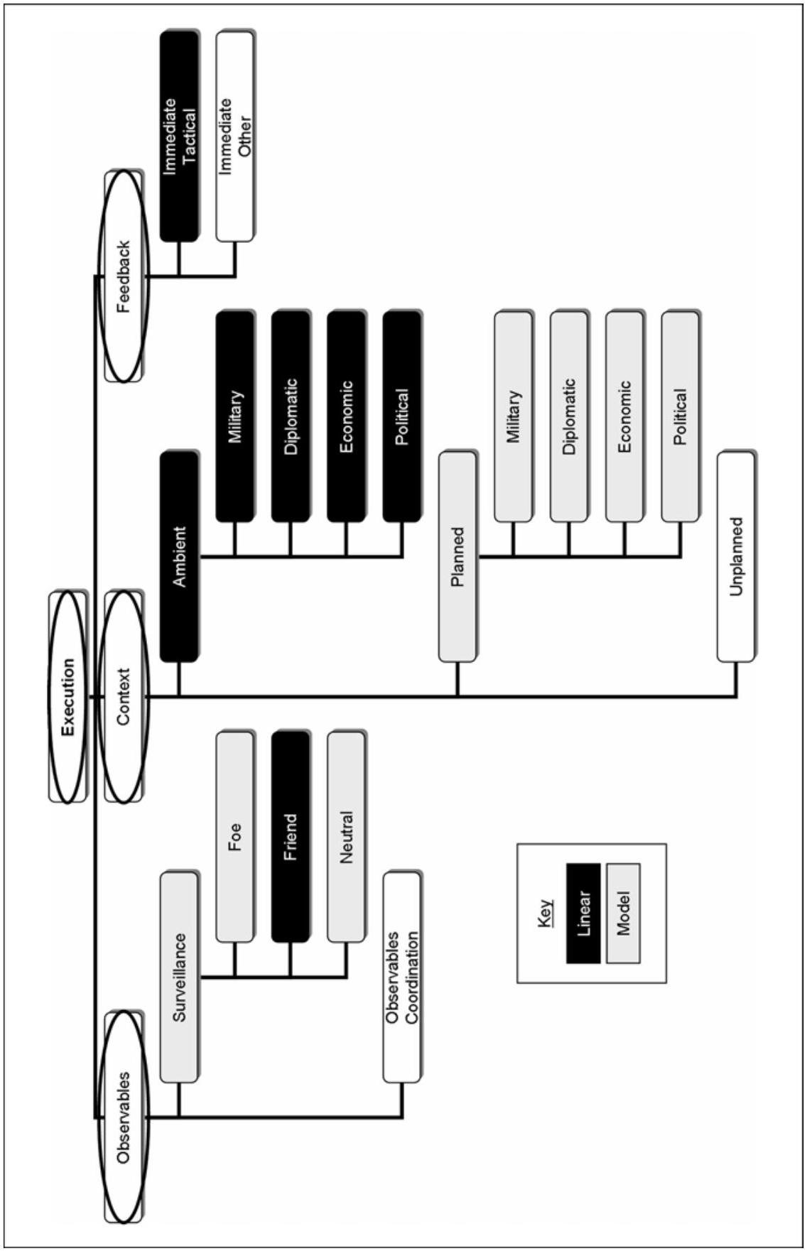最后,在上述所有环节中均存在一项重大附加考量:在与复杂适应性对手(complex adaptive opponent)的任何交互中,开发单一且持久的模型均不足够。此类遭遇唯一确定的是,交互将随每次互动而变化,且经精心建模的系统组成部分亦将以某种方式随之改变。因此,如同态势感知的迭代演进,所用任何模型均须具备充分的动态性与灵活性,以在局势演进过程中纳入并反映变化。