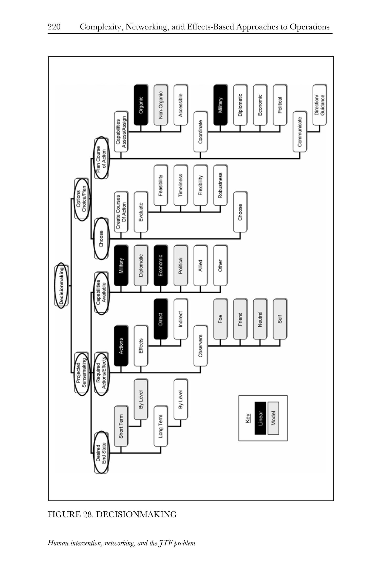审视部落长老与"基地"组织首领如何应对基于效果作战的复杂性,显而易见二者均采取了可称为经典范式的方法:他们依赖相关人类决策者的经验、直觉与创新能力。其缺陷在于,所作决策与评估的质量仅取决于实施者的个人能力——而在关键时刻恰好出现军事或政治天才的情况远非必然。就此而言,联合特遣部队的情况仅略占优势。其显著的连通性(connectivity)优势至少在理论上使其能够接入由其他决策者构成的网络,这些决策者在特定问题领域更具专业性,例如评估某项特定行动可能引发的外交连锁反应(diplomatic cascades)或次生影响。换言之,借助网络化能力,决策质量不再由单一决策者的能力决定,而是取决于可能参与决策的全体决策者的综合能力。逻辑上,拥有更充裕的时间与更广泛的网络,所获建议与最终决策的质量有望大幅提升。\({ }^{189}\) 同样,连通性还使联合特遣部队能够访问并查询庞大的国家级知识库(national knowledge base),并可能提供一套分析工具与模型套件,用于进一步优化其评估与决策。\({ }^{190}\)