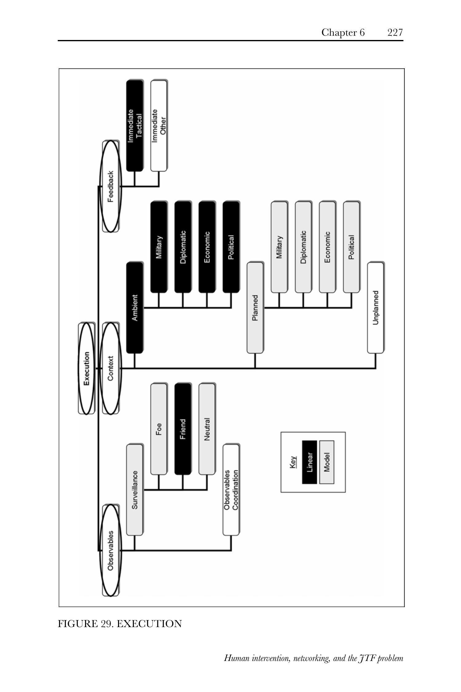 此处正是对基于效果的行动-反应循环(effects-based action-reaction cycle)进行剖析与逐层分解(drill-down)的价值所在。我们可以运用核心流程(essential processes)与逐层分解方法,或对行动-反应循环及其基本要素进行类似剖析,作为参照框架来审视联合特遣部队(Joint Task Force, JTF)的评估、规划与执行流程,从而识别可能遭遇模糊性与不确定性的环节,以及复杂性最易滋生的节点。换言之,我们能够确定需要人工介入的关键点,进而初步勾勒出可能需要决策支持的人类"节点"(human "nodes")路线图。\({ }^{195}\) 随着我们对每个节点及其所蕴含的问题、子流程与疑问进行更深层次的剖析,便可逐步识别哪些要素可能受益于额外的信息输入(例如来自数据挖掘(data-mining)或智能代理(intelligent agents)的应用)、各类线性分析方法(例如模式分析(pattern analysis))、认知建模与仿真(cognitive modeling and simulation)及社会建模与仿真(social modeling and simulation),抑或通过网络化引入的特定复杂主题领域人类专家(human experts)的输入。