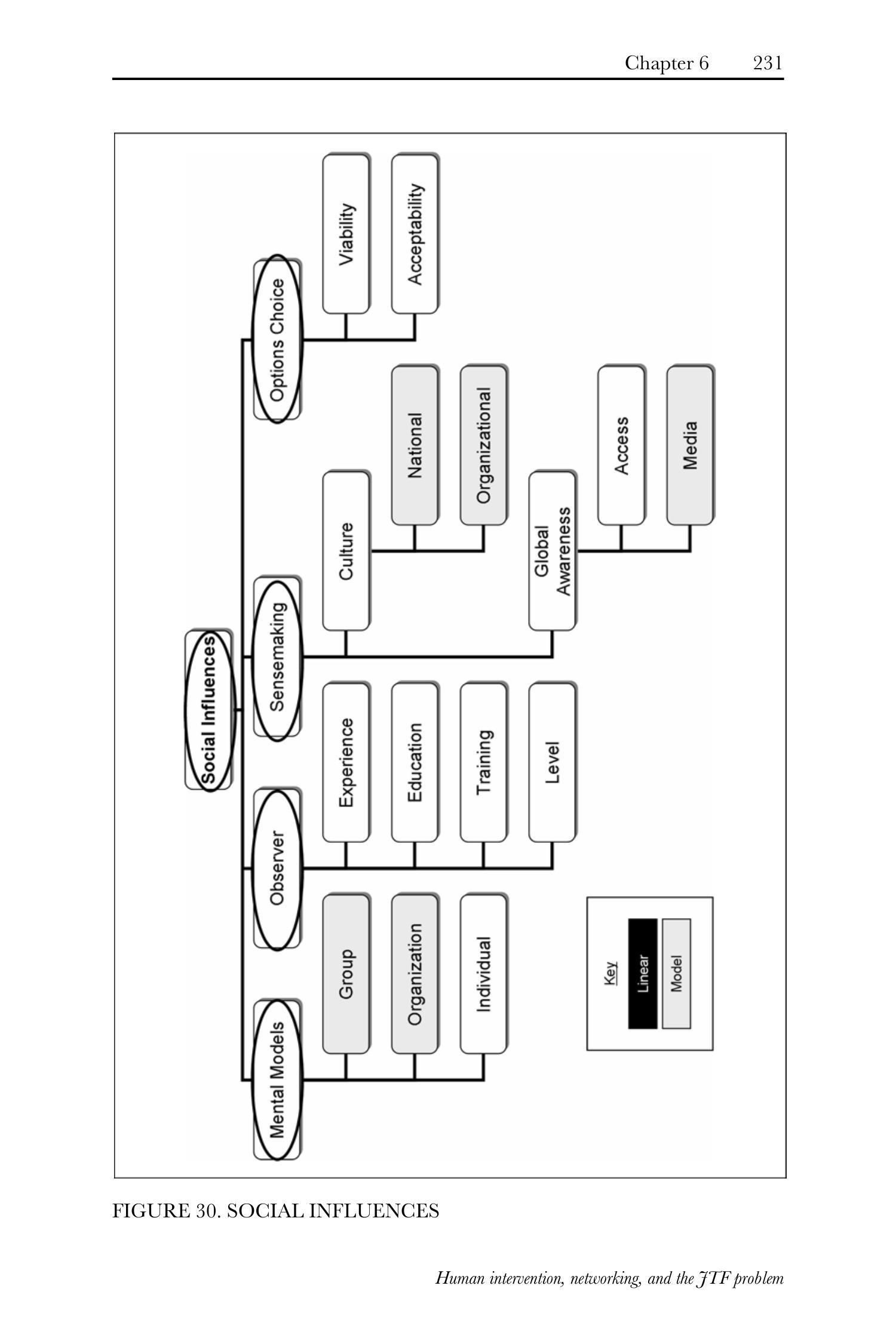 由于生成社会影响的社会过程(social processes)涉及众多相互依存的变量,其完整范围永难穷尽,故其对联合特遣部队评估与规划流程的影响必然复杂。为应对该复杂性以限定决策范围——无论是在确保规划与执行能够支撑政治共识,抑或在评估观察者可能反应方面——将需依赖两类工具:一类用于收集信息与知识以更新知识库;另一类用于对相关社会行为进行建模——可能包括群体与组织心智模型、理解框架(frameworks for understanding)、意义建构中的影响因素、世界观(weltanschauung)以及对特定行动方案可行性与可接受性的认知。然而,此类建模工具常面临"垃圾进、垃圾出"(garbage in, garbage out)问题:尤其在尝试建模非西方行为时,它们高度依赖主观/定性输入(subjective/qualitative inputs),因而取决于获取并输入数据与信息者的专业知识水平。这表明需持续引入主题专家(subject matter expert)参与:或引导模型使用,或在时间紧迫时直接向联合特遣部队指挥官提供输入或解答其疑问。\({ }^{212}\)