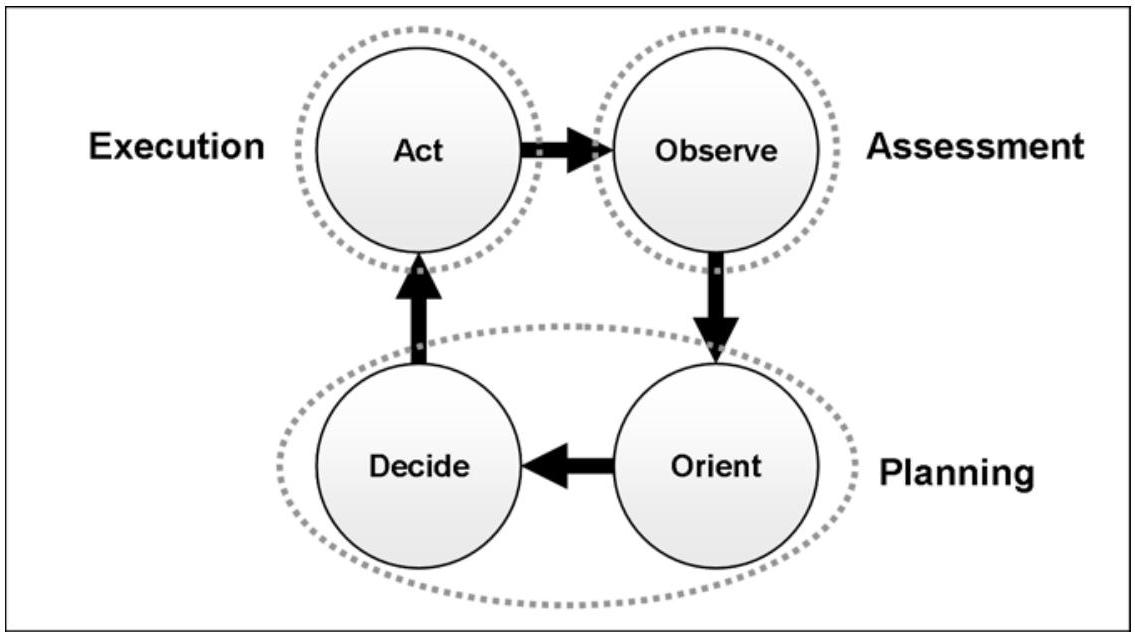 原则上,上述问题及战术指挥官的适应能力均非新现象。事实上,本书及其前作已探讨两种具备可扩展性、快速且循环性的流程:OODA循环(OODA loop, Observe-Orient-Decide-Act loop)与行动-反应循环(action-reaction cycle)。尽管二者均未被明确视为规划流程,但均代表了问题解决的连续循环方法。事实上,OODA循环最初构想用于战术战斗机交战(tactical fighter engagements),其流程要素由飞行员在一系列空中机动过程中实时于脑海中完成。\({ }^{260}\) 此外,二者均可依据规划、执行与评估流程进行定义,以支撑效果导向方法。在OODA循环中,"判断"(Orient)与"决策"(Decide)环节可等同于效果导向作战的规划阶段,\({ }^{261}\) "行动"(Act)环节对应执行阶段,"观察"(Observe)环节对应评估阶段——所有环节压缩至可能不足90秒的循环内(见图44)。更进一步,OODA循环亦预设两个或多个交互式OODA循环之间的持续互动,一方行动的变化驱动另一方行动的变化。换言之,它代表了复杂适应系统之间的交互。