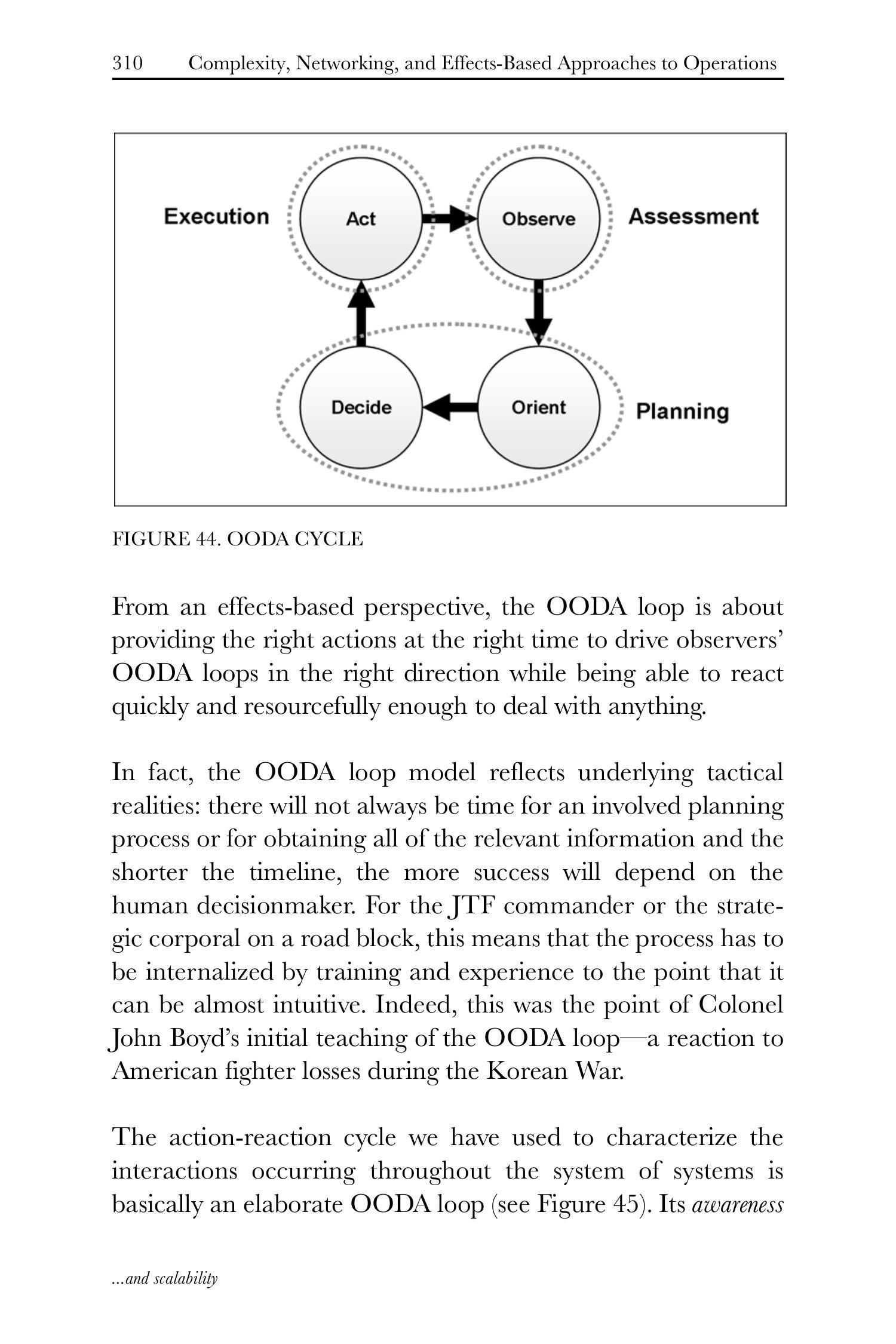 事实上,OODA循环模型反映了底层战术现实:并非总有时间进行详尽规划流程或获取全部相关信息;时间线越短,成功便越依赖人类决策者。对联合特遣部队(JTF, Joint Task Force)指挥官或路障处的战略列兵(strategic corporal)而言,这意味着该流程必须通过训练与经验内化至近乎直觉的程度。约翰·博伊德上校(Colonel John Boyd)最初讲授OODA循环的要旨正在于此——作为对朝鲜战争期间美军战斗机损失的回应。