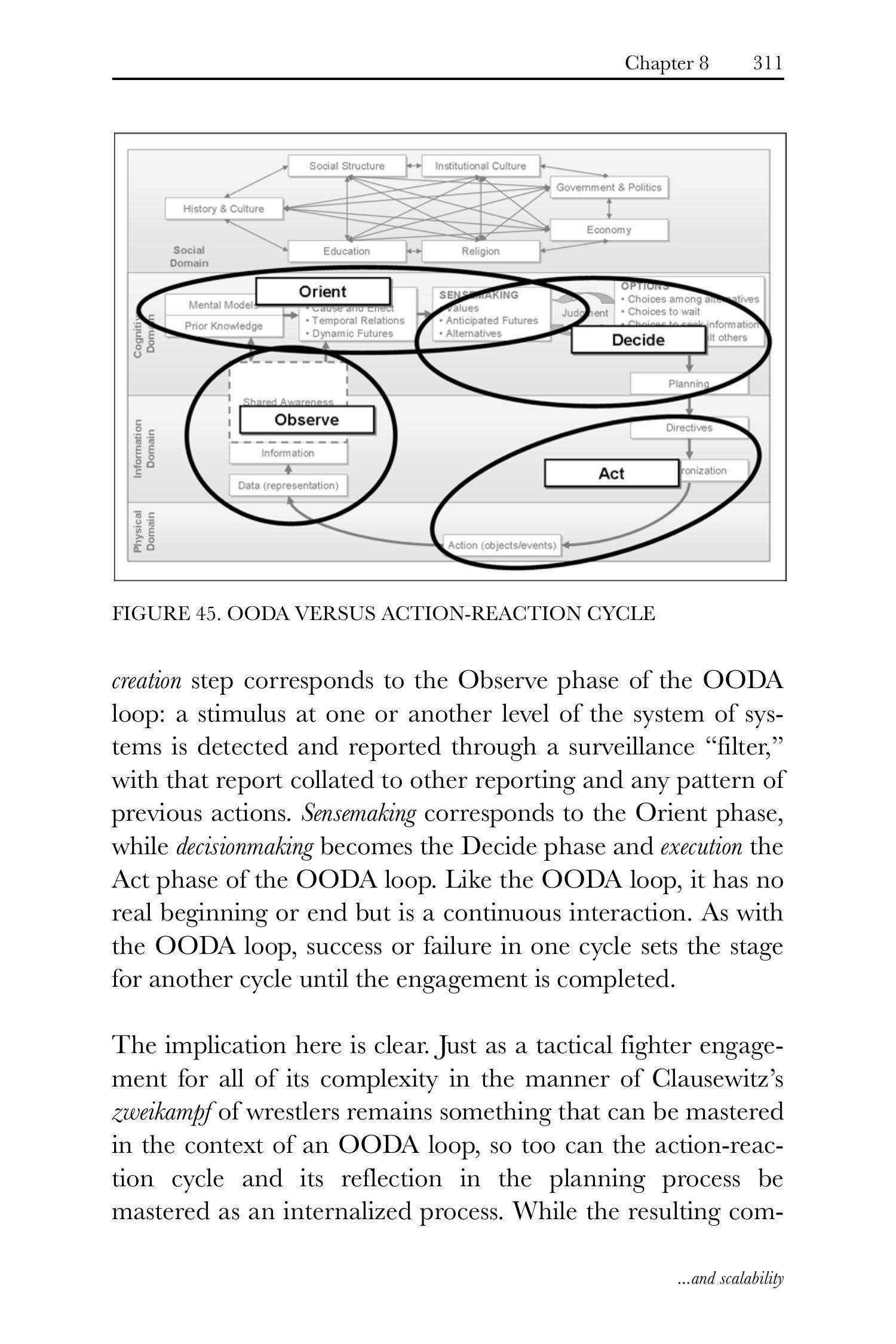 我们用于刻画体系之体系(system of systems)全域交互的行动-反应循环,本质上是一个精细化的OODA循环(见图45)。其态势感知创建步骤对应OODA循环的"观察"阶段:体系之体系某一层级的刺激经由监视"过滤器"(surveillance "filter")探测并报告,该报告与其它报告及既往行动模式进行整合。意义建构(sensemaking)对应"判断"阶段,决策对应"决策"阶段,执行对应"行动"阶段。与OODA循环类似,它并无真正起点或终点,而是一种持续交互。如同OODA循环,单次循环的成败将为下一轮循环奠定基础,直至交战结束。