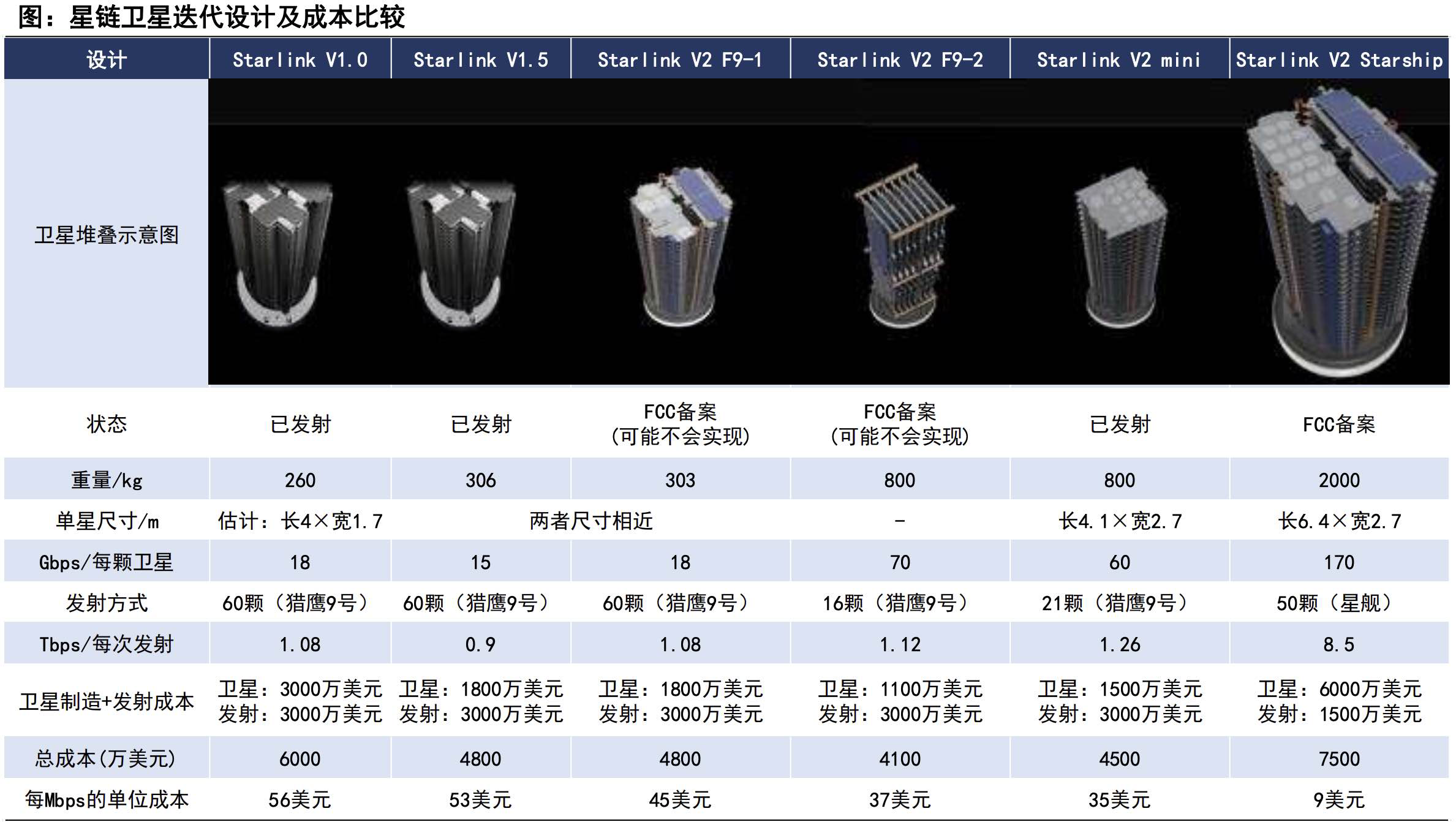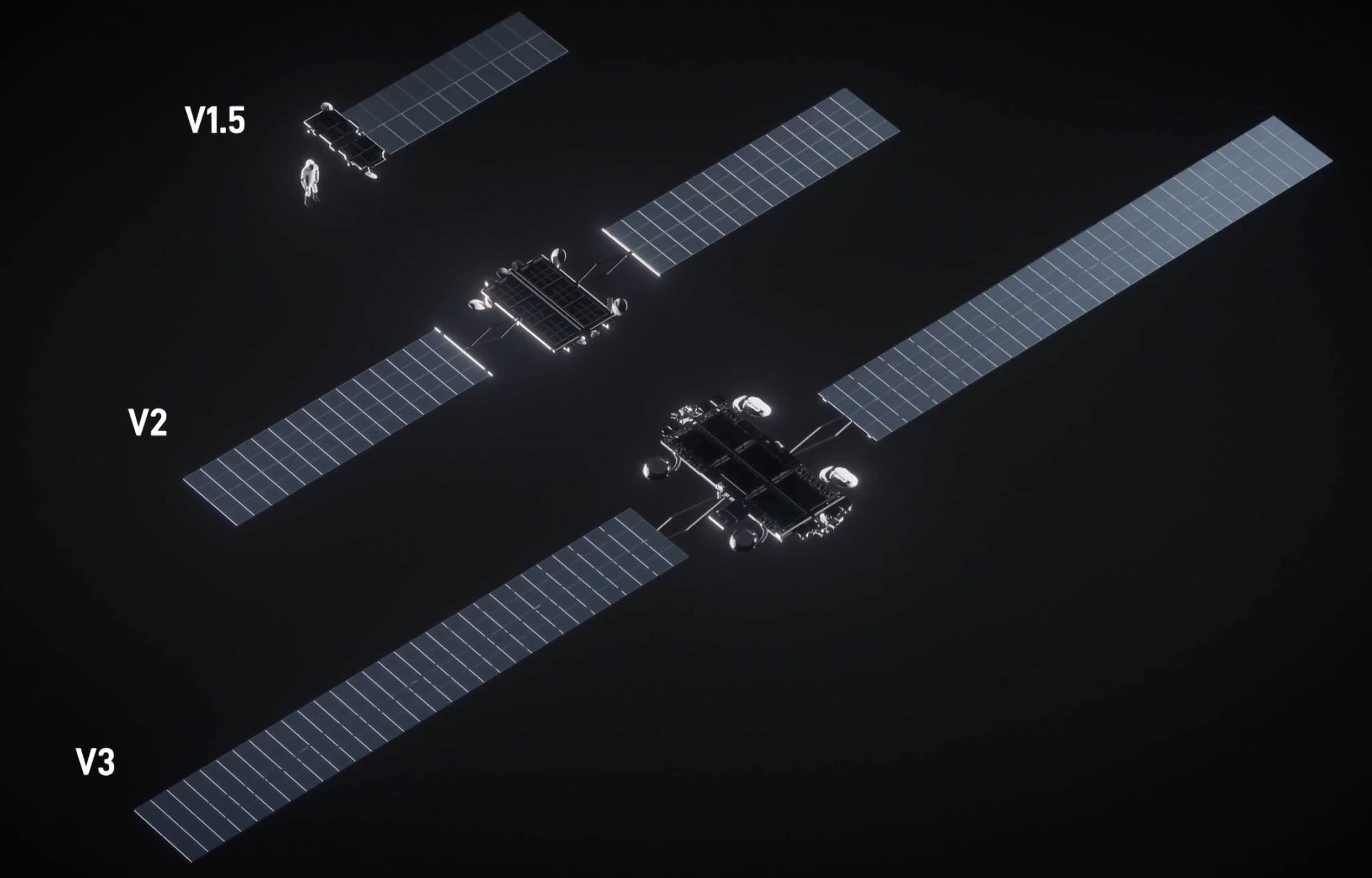 目前密集组网的1代和2代星链星座包含4个版本的卫星:V0.9、V1.0、V1.5、V2.0mini和V2.0。