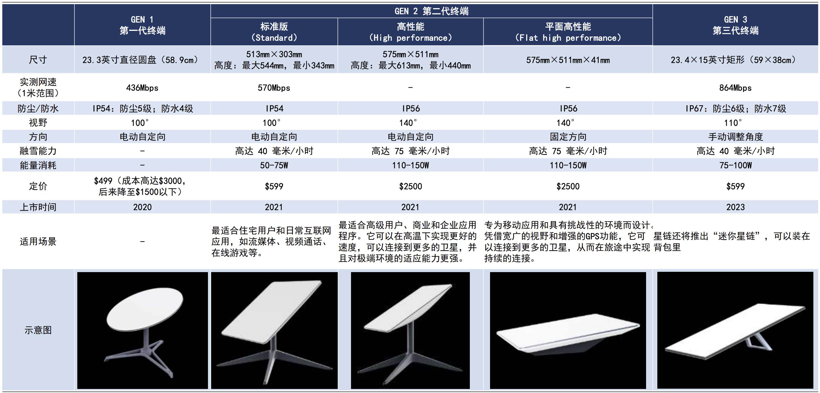 Gen 2 Dish(第二代碟形天线):第二代 Dishy 改为矩形,尺寸为 20.25 英寸 ×12 英寸(51.4 厘米 ×30.5 厘米),相比第一代更加小巧轻薄,为后续更紧凑的设计奠定了基础,但它缺少一些较新的功能。