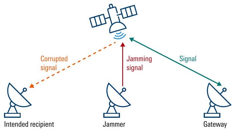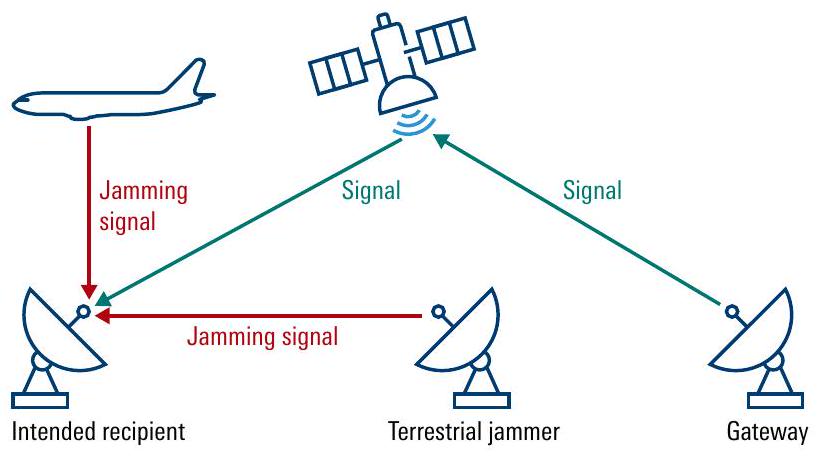 欺骗(Spoofing)则是另一种电子攻击方式,即攻击者生成虚假信号。例如,当欺骗攻击针对卫星下行链路(downlink)数据时,可能向地面接收系统注入虚假或错误数据。劫持卫星遥测、跟踪与控制(Telemetry, Tracking and Control, TT&C)链路并注入伪造数据,是另一种已知的干扰方式。一旦TT&C链路被成功欺骗,攻击者在理论上可控制该卫星。防御欺骗的主要对策是加密(encryption),用于识别虚假数据注入。
