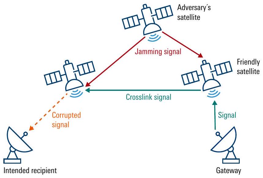 星间链路通信(crosslink communications)是指两颗卫星间的数据交换,可采用射频或光学方式。例如,SpaceX的星链(StarLink)卫星使用光学星间链路通信。 如图9所示,在星间干扰中,敌方卫星可部署于适当位置,以干扰两颗友方卫星间的链路信号。所有卫星必须保持相互视距。使用定向天线或相控阵天线(phased array antennas)可降低敌方干扰的有效性。