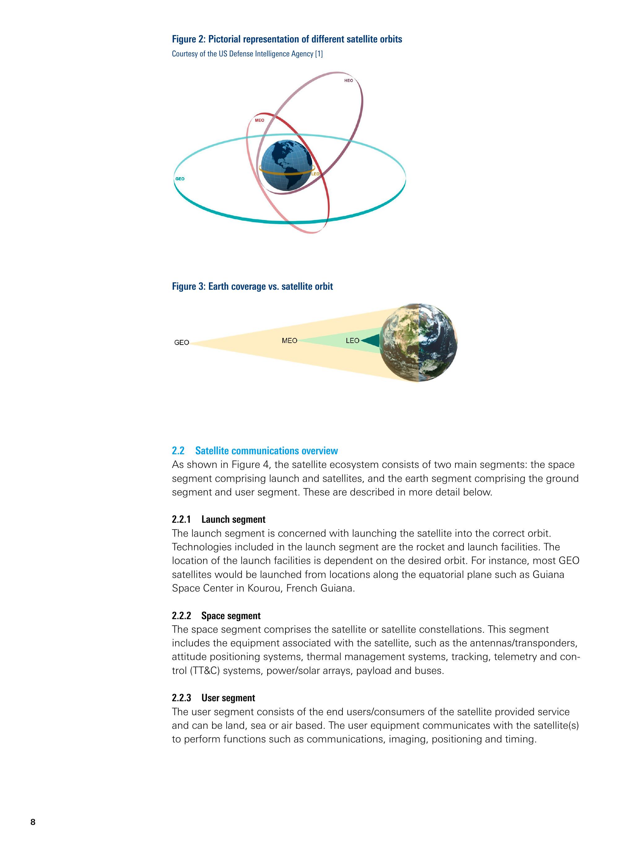 发射段涉及将卫星送入目标轨道的全部活动。其技术包括火箭与发射设施。发射场选址取决于目标轨道类型。例如,大多数GEO卫星通常从赤道附近地区发射,如法属圭亚那库鲁(Kourou)的圭亚那航天中心(Guiana Space Center)。