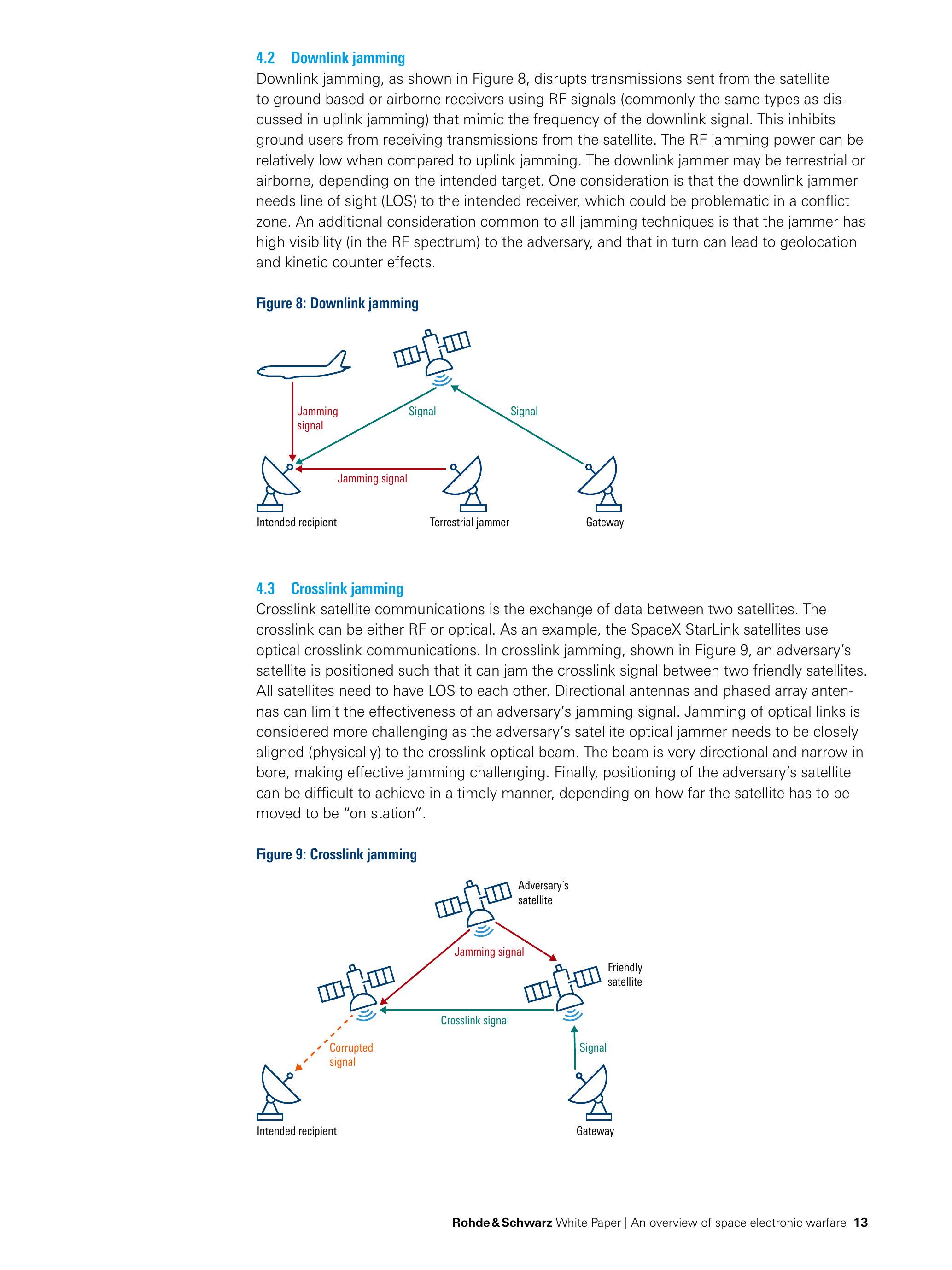 星间链路通信(crosslink communications)是指两颗卫星间的数据交换,可采用射频或光学方式。例如,SpaceX的星链(StarLink)卫星使用光学星间链路通信。 如图9所示,在星间干扰中,敌方卫星可部署于适当位置,以干扰两颗友方卫星间的链路信号。所有卫星必须保持相互视距。使用定向天线或相控阵天线(phased array antennas)可降低敌方干扰的有效性。