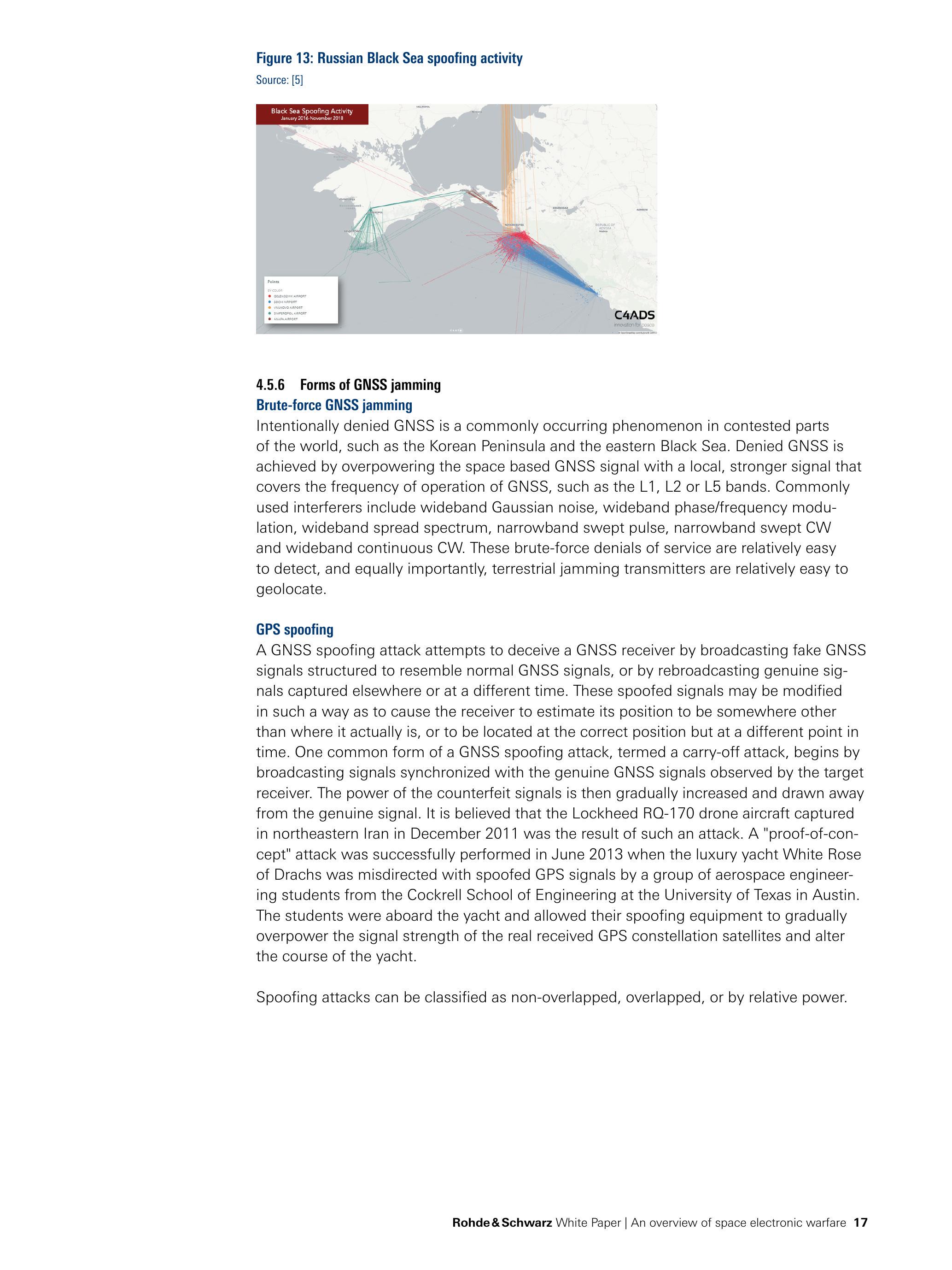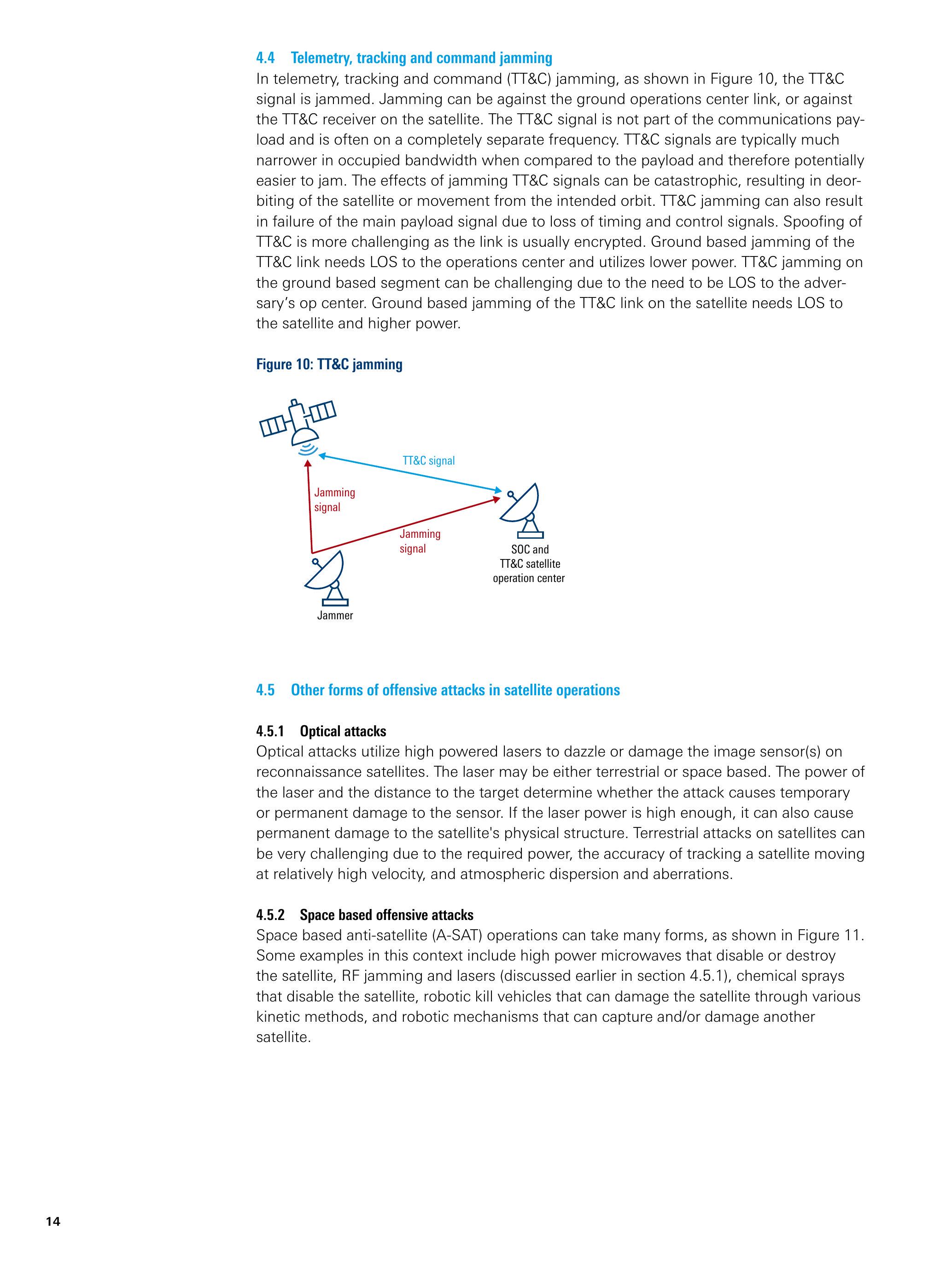 欺骗(Spoofing)则是另一种电子攻击方式,即攻击者生成虚假信号。例如,当欺骗攻击针对卫星下行链路(downlink)数据时,可能向地面接收系统注入虚假或错误数据。劫持卫星遥测、跟踪与控制(Telemetry, Tracking and Control, TT&C)链路并注入伪造数据,是另一种已知的干扰方式。一旦TT&C链路被成功欺骗,攻击者在理论上可控制该卫星。防御欺骗的主要对策是加密(encryption),用于识别虚假数据注入。