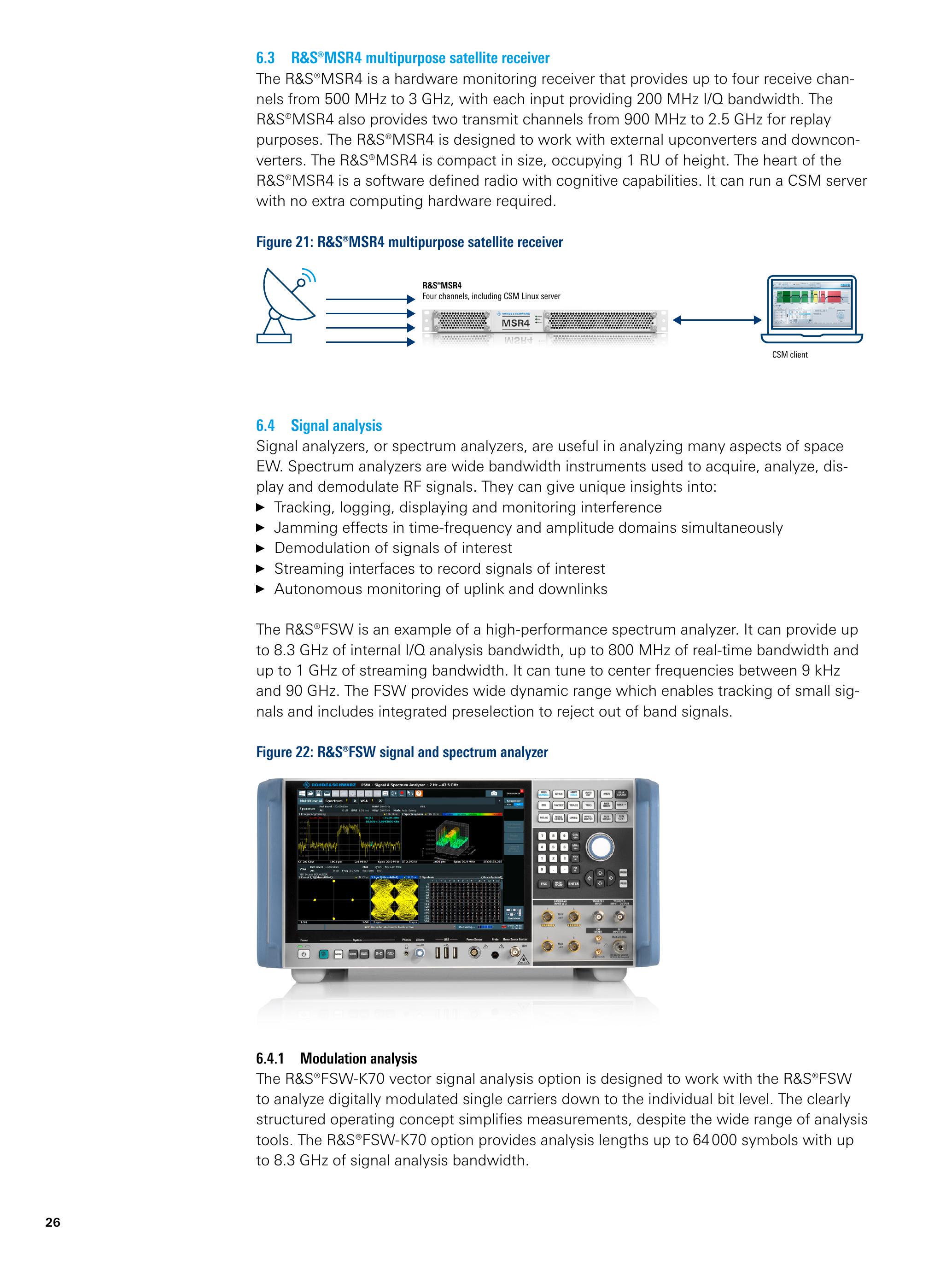 结合R&S \({ }^{®}\) FSW,R&S \({ }^{®}\) FSW-K70M多调制分析选件(multi-modulation analysis option)与R&S \({ }^{®}\) FSW-K70P误码率测量选件(BER PRBS measurements option)可用于验证卫星通信链路的完整性。