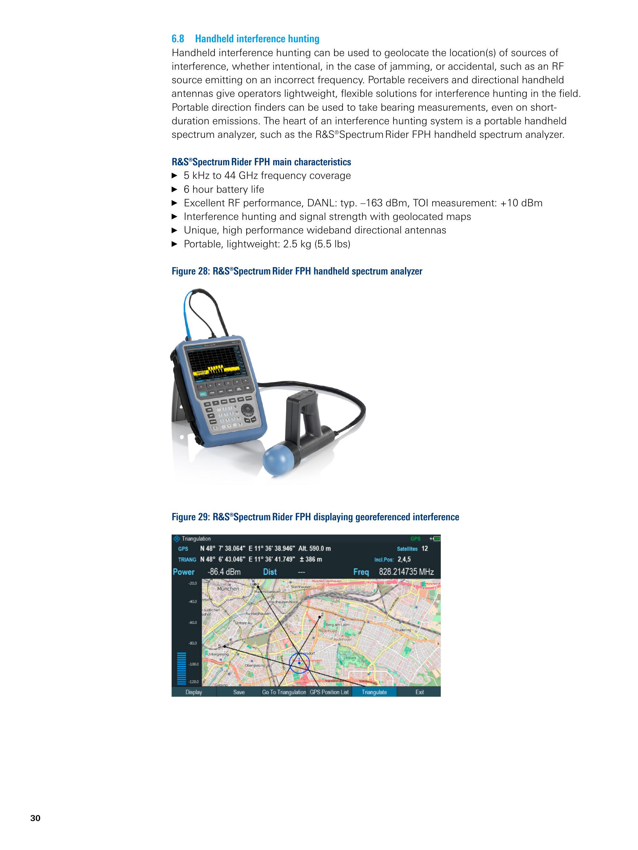 便携式测向仪可在短时发射情况下执行方位测量。干扰追踪系统的核心是手持频谱分析仪,例如R&S \({ }^{®}\) Spectrum Rider FPH。