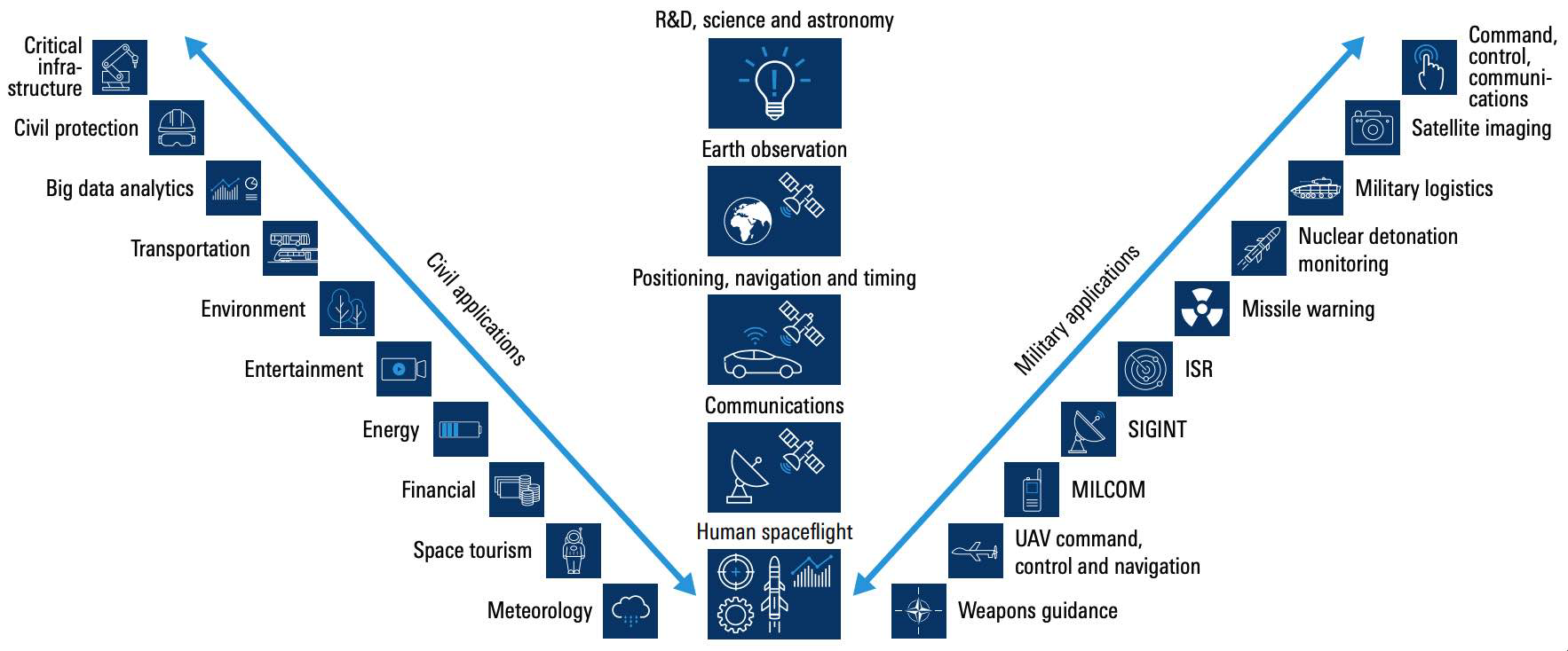 图1展示了空间领域的复杂性及其承载的多样化需求。左侧为民用空间应用,右侧为军事应用。