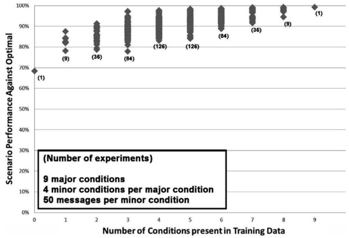 图10.5展示了在开发BBN认知引擎(BBN SO)(参见例7.1 [3])过程中收集的 \(n\)-choose-\(k\) 测试结果。针对 \(n=9\) 个环境中的每一个,SD 在所有可能的子集 \(k \subseteq n\) 上训练SO,并在全部九个环境上进行测试。该图表共包含512次独立测试,涵盖从 \(k=0\)(无任何先验训练数据)到 \(k=9\)(在全部 \(n=9\) 个环境上训练,但测试时SO不知道环境出现顺序)的各种情况。
