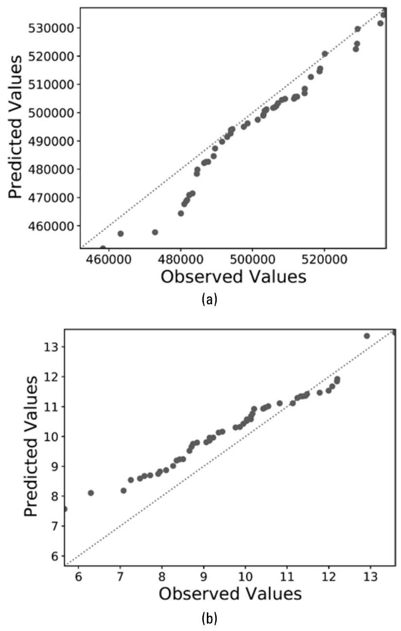 图10.6 为比较预测值范围不同的模型,必须将 RMSE 除以标准差进行归一化。(a)度量指标 \(m_{1}\) 的取值范围为 458,365 至 537,068,均值 \(\mu = 501,041\),标准差 \(\sigma = 18,061\);RMSE 为 6,328,对应 nRMSE 为 0.350。(b)度量指标 \(m_{2}\) 的取值范围为 5.7 至 13.6,均值 \(\mu = 9.7\),标准差 \(\sigma = 1.7\);RMSE 为 0.76,对应 nRMSE 为 0.442。(当所有预测值与真实值完全一致并落在灰色对角线上时,nRMSE = 0.0。)